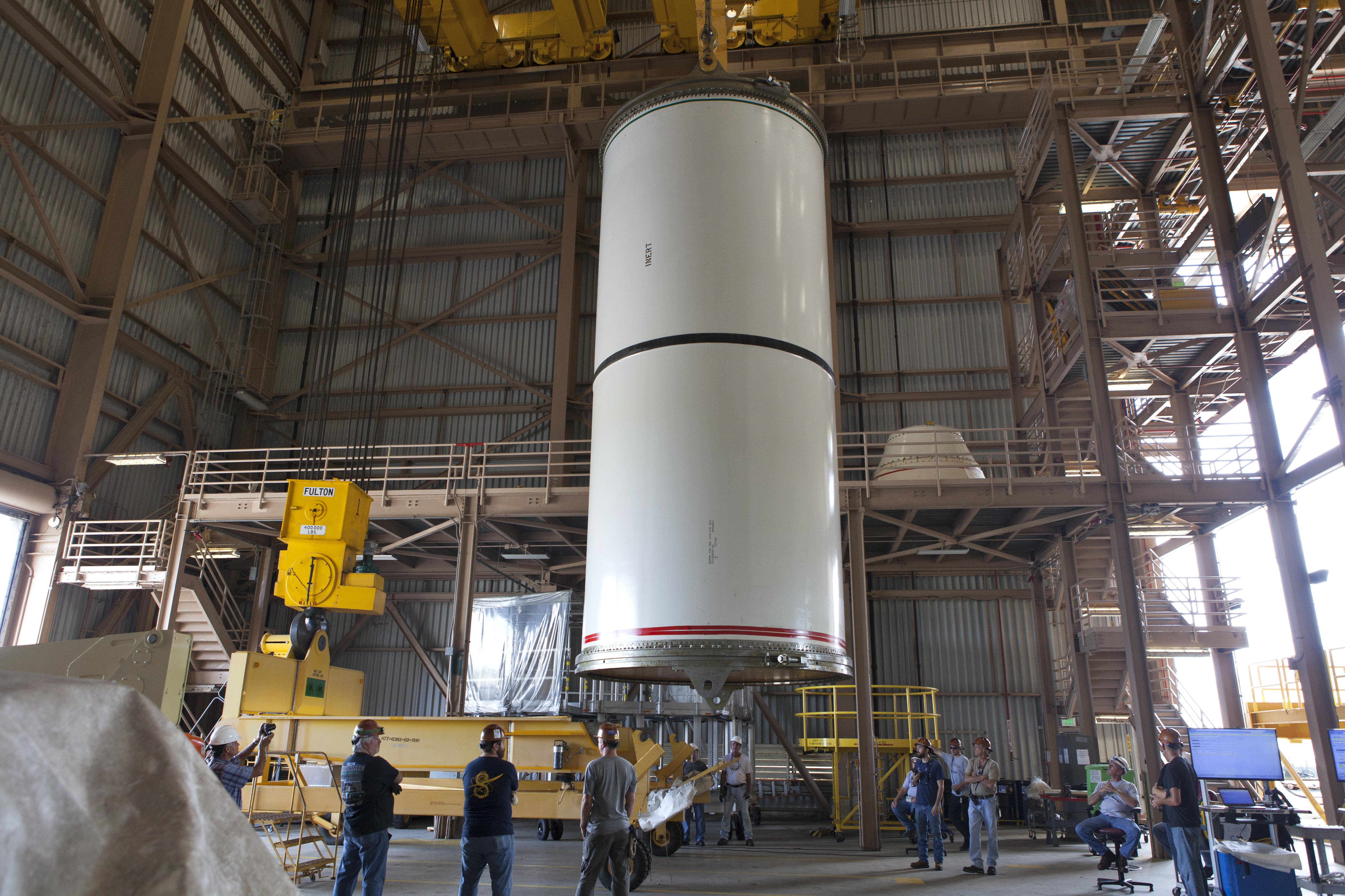 Jacobs technicians, on the Test and Operations Support Contract, practice crane operations with an inert booster rocket segment in the Rotation, Processing and Surge Facility on June 22, 2018, at NASA's Kennedy Space Center in Florida. Dual cranes are being used to move the segment from vertical to horizontal, a maneuver known as a "breakover rotation." As part of routine processing operations for the agency's Space Launch System (SLS) rocket, the RPSF team will receive all of the solid rocket fuel segments for inspection and preparation prior to transporting them to the Vehicle Assembly Building for stacking on the mobile launcher. Many pathfinding operations are being done to prepare for launch of the SLS and Orion spacecraft on Exploration Mission-1 and deep space missions.