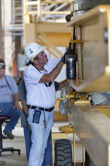 A Jacobs technician, on the Test and Operations Support Contract, checks bolt fittings during practice crane operations with an inert booster rocket segment in the Rotation, Processing and Surge Facility on June 22, 2018, at NASA's Kennedy Space Center in Florida. Dual cranes will be used to move the segment from vertical to horizontal, a maneuver known as a "breakover rotation." As part of routine processing operations for the agency's Space Launch System (SLS) rocket, the RPSF team will receive all of the solid rocket fuel segments for inspection and preparation prior to transporting them to the Vehicle Assembly Building for stacking on the mobile launcher. Many pathfinding operations are being done to prepare for launch of the SLS and Orion spacecraft on Exploration Mission-1 and deep space missions.
