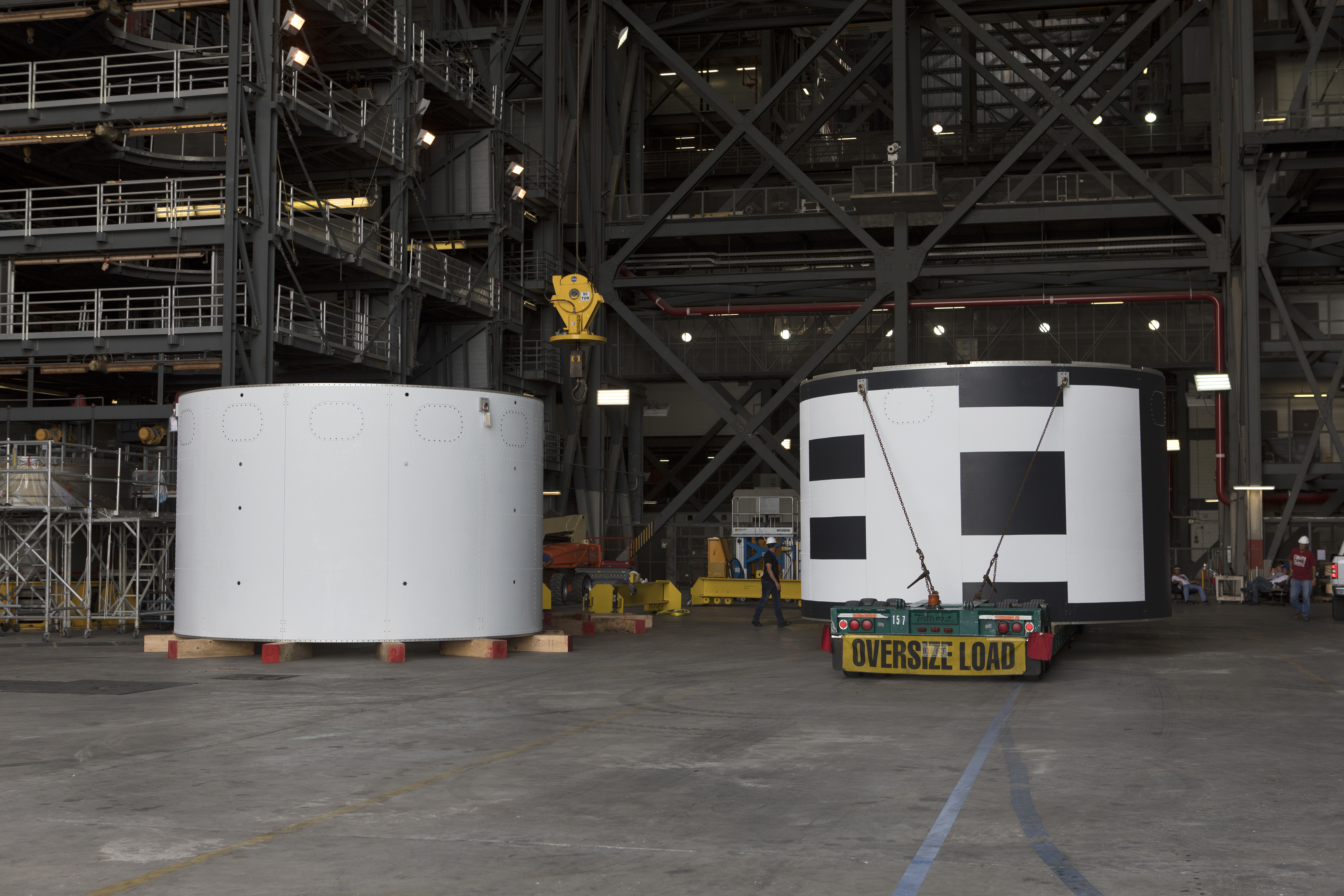 The second of three aeroshells, at right, for Orion's Launch Abort System (LAS) arrives by flatbed truck in High Bay 4 of the Vehicle Assembly Building at NASA's Kennedy Space Center in Florida, on June 26, 2018. The aeroshell was shipped from EMF Inc. on nearby Merritt Island. It will be offloaded and secured in the high bay. The aeroshells will be stacked and prepared for a full-stress test of the LAS, called Ascent Abort-2 (AA-2) flight test, scheduled for April 2019. During the test, a booster will launch from Space Launch Complex 46 at Cape Canaveral Air Force Station, carrying a fully functional LAS and a 22,000-pound Orion test vehicle to an altitude of 31,000 feet and traveling at more than 1,000 miles an hour. The test will verify the LAS can steer the crew module and astronauts aboard to safety in the event of an issue with the Space Launch System (SLS) rocket when the spacecraft is under the highest aerodynamic loads it will experience during a rapid climb into space. Orion is being prepared for its first integrated uncrewed flight atop the SLS on Exploration Mission-1.