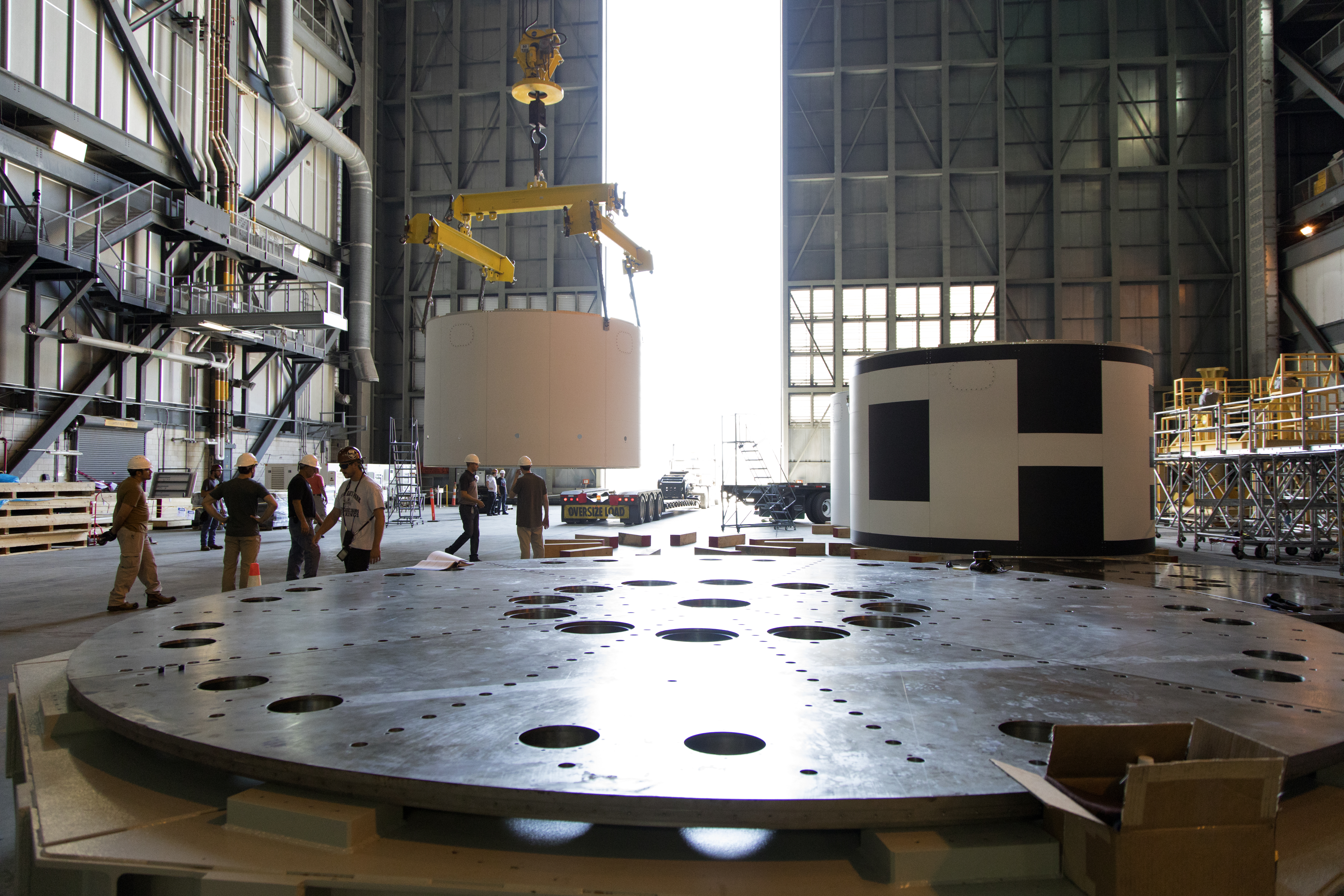 The third and final aeroshell for Orion's Launch Abort System (LAS) is lifted by crane and will be lowered onto slats in High Bay 4 of the Vehicle Assembly Building on July 12, 2018, at NASA's Kennedy Space Center in Florida. The aeroshell was shipped from EMF Inc. on nearby Merritt Island. All three aeroshells will be stacked and prepared for a full-stress test of the LAS, called Ascent Abort-2 (AA-2) flight test, scheduled for April 2019. During the test, a booster will launch from Space Launch Complex 46 at Cape Canaveral Air Force Station, carrying a fully functional LAS and a 22,000-pound Orion test vehicle to an altitude of 31,000 feet and traveling at more than 1,000 miles an hour. The test will verify the LAS can steer the crew module and astronauts aboard to safety in the event of an issue with the Space Launch System (SLS) rocket when the spacecraft is under the highest aerodynamic loads it will experience during a rapid climb into space. Orion is being prepared for its first integrated uncrewed flight atop the SLS on Exploration Mission-1.