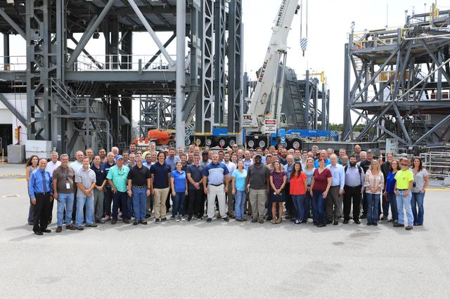 The team that tested the umbilical lines and accessories that will connect from the mobile launcher to NASA's Space Launch System rocket and Orion spacecraft for Exploration Mission-1 hold a banner signing event July 24, 2018, to mark completion of testing at the Launch Equipment Test Facility (LETF) at NASA's Kennedy Space Center in Florida. Speaking at the event is Andy Allen, far right, program manager for Jacobs TOSC. Next to him, from left, are Shawn Quinn, director of Engineering; Scott Colloredo, deputy director of Engineering; and Russ Deloach, director of Safety and Mission Assurance. A total of 21 umbilicals and launch accessories were tested on various simulators at the LETF before they were transferred to the mobile launcher for installation.