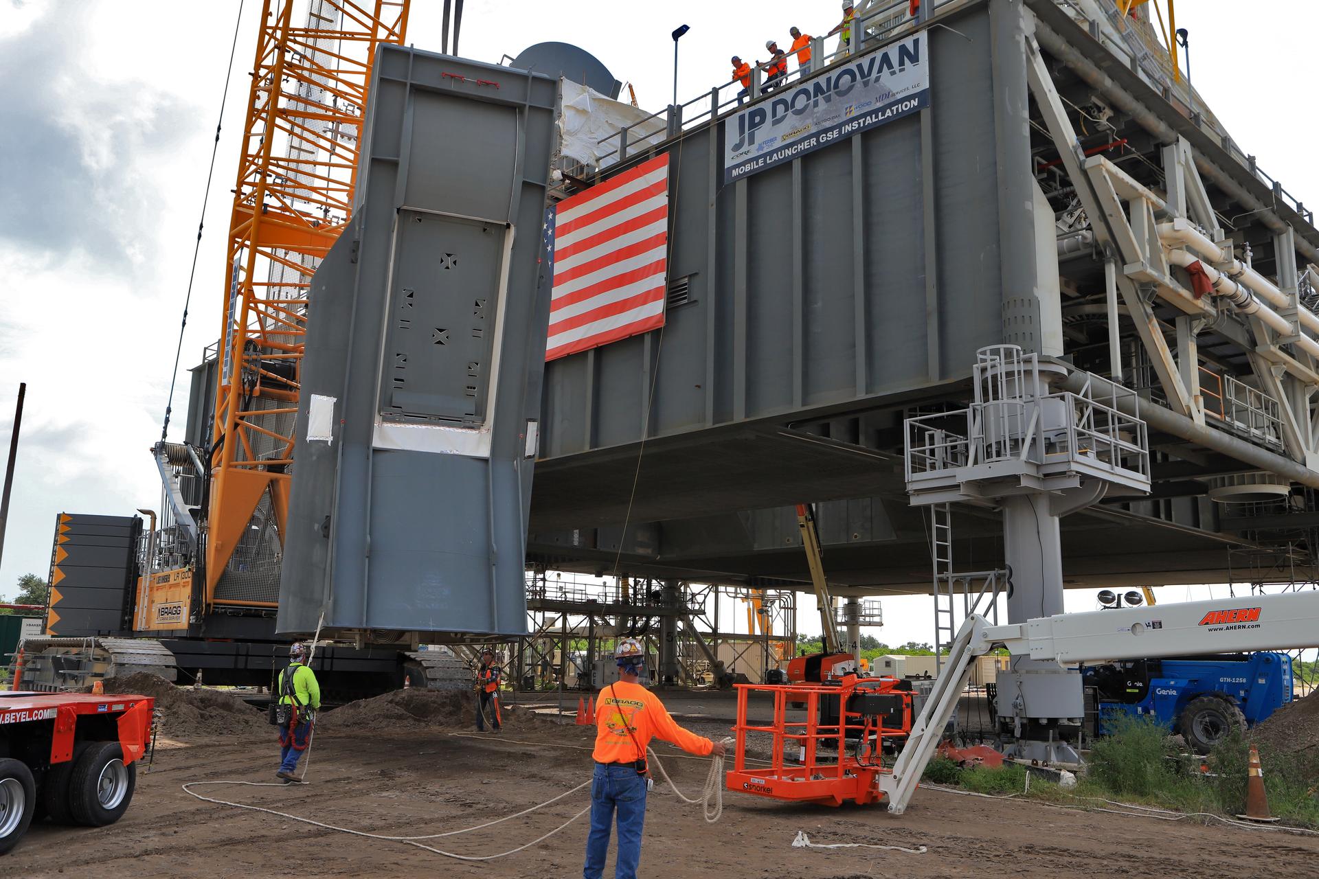 Construction workers with JP Donovan assist as a crane lifts the second of two Tail Service Mast Umbilicals up for installation on the 0-level deck of the mobile launcher on July 27, at NASA's Kennedy Space Center in Florida. The 35-foot-tall umbilical will connect to NASA's Space Launch System rocket core stage aft section and provide liquid hydrogen and electrical cable connections to the core stage engine section to support propellant handling during prelaunch operations. The installation brings Exploration Ground Systems one step closer to supporting prelaunch operations for the agency's SLS rocket and Orion spacecraft on Exploration Mission-1 and deep space destinations.