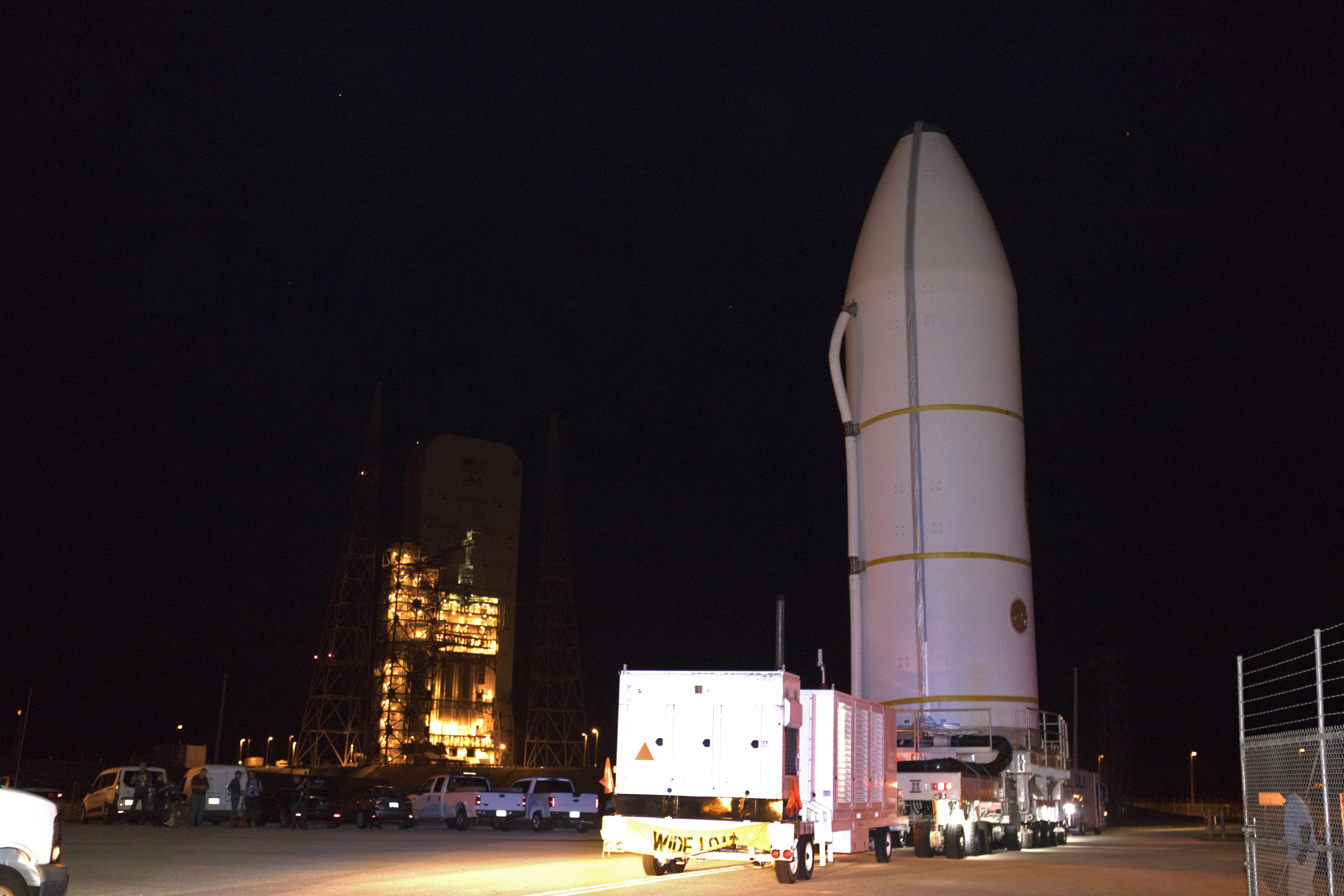 On Monday, July 30, 2018 NASA's Parker Solar Probe, encapsulated in its payload fairing, arrives at Space Launch Complex 37 at Cape Canaveral Air Force Station where it will be mated atop a United Launch Alliance Delta IV Heavy rocket. The mission will perform the closest-ever observations of a star when it travels through the Sun's atmosphere, called the corona. The probe will rely on measurements and imaging to revolutionize our understanding of the corona and the Sun-Earth connection.