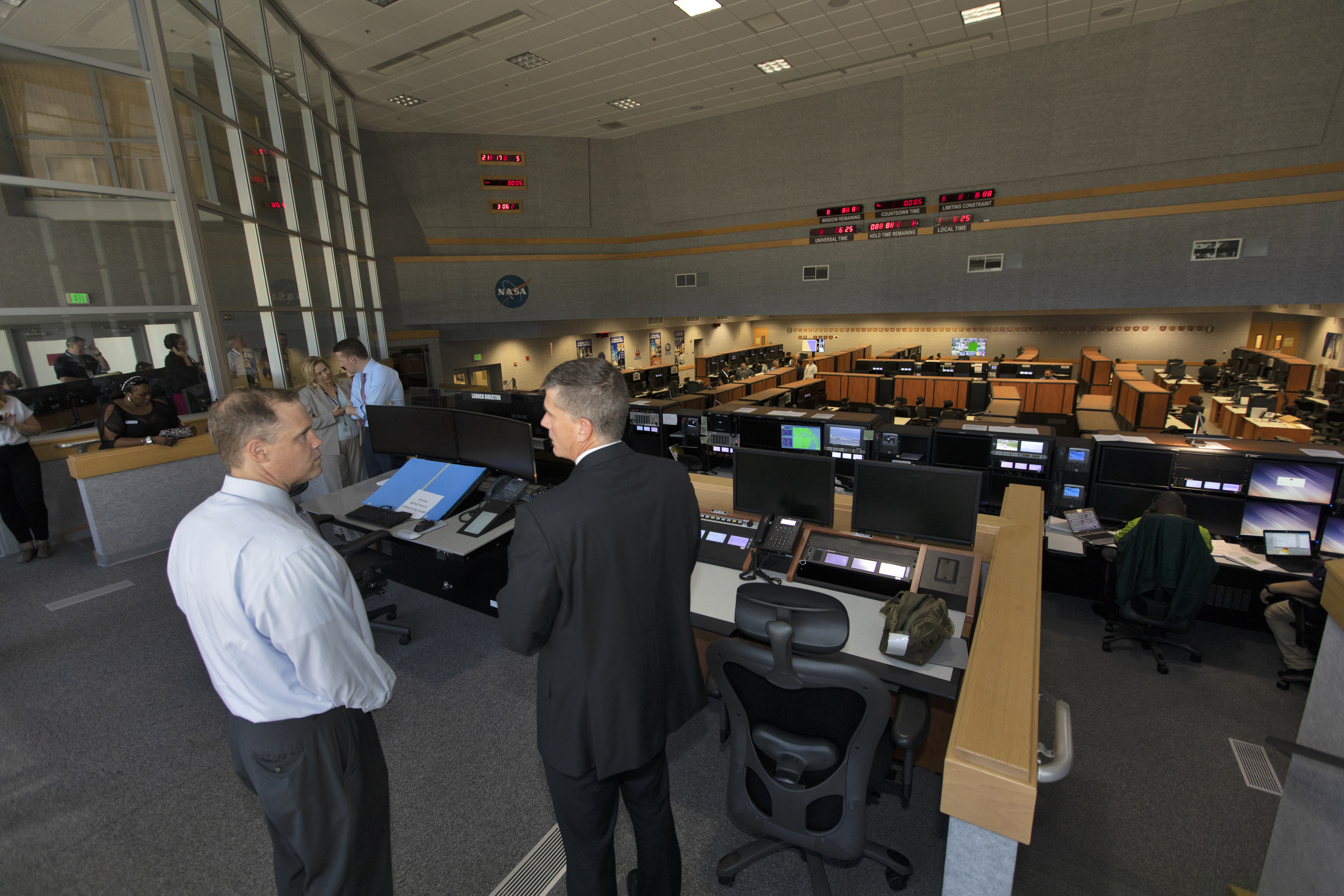 NASA Administrator Jim Bridenstine (left) is briefed by Jeremy Graeber, chief of Test, Launch and Recovery Operations during a tour of the Firing Room of the Launch Control Center at NASA's Kennedy Space Center. Bridenstine made his first official visit to the Florida spaceport on Aug. 6 and 7, 2018.
