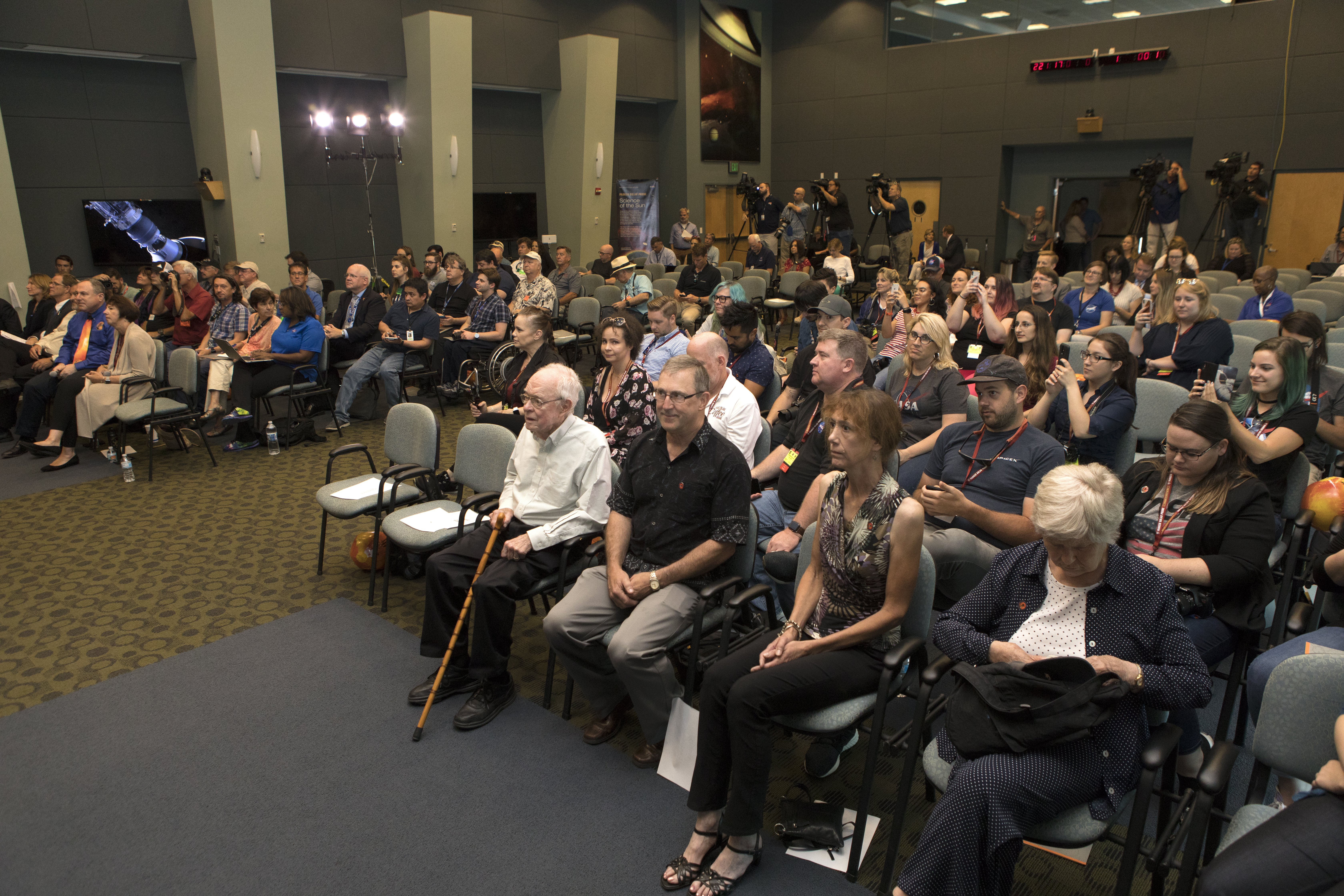 In the Kennedy Space Center's Operations and Support Building II, Thursday, Aug. 9, 2018, members of the media participate in a prelaunch mission briefing on NASA's Parker Solar Probe. Listening to the presentation is Eugene Parker, front row, far left, the S. Chandrasekhar Distinguished Service Professor Emeritus, Department of Astronomy and Astrophysics at the University of Chicago. This is the first NASA mission that has been named for a living individual. The Parker Solar Probe will lift off on a United Launch Alliance Delta IV Heavy rocket from Space Launch Complex 37 at Cape Canaveral Air Force Station in Florida. The spacecraft was built by Applied Physics Laboratory of Johns Hopkins University in Laurel, Maryland. The mission will perform the closest-ever observations of a star when it travels through the Sun's atmosphere, called the corona. The probe will rely on measurements and imaging to revolutionize our understanding of the corona and the Sun-Earth connection.