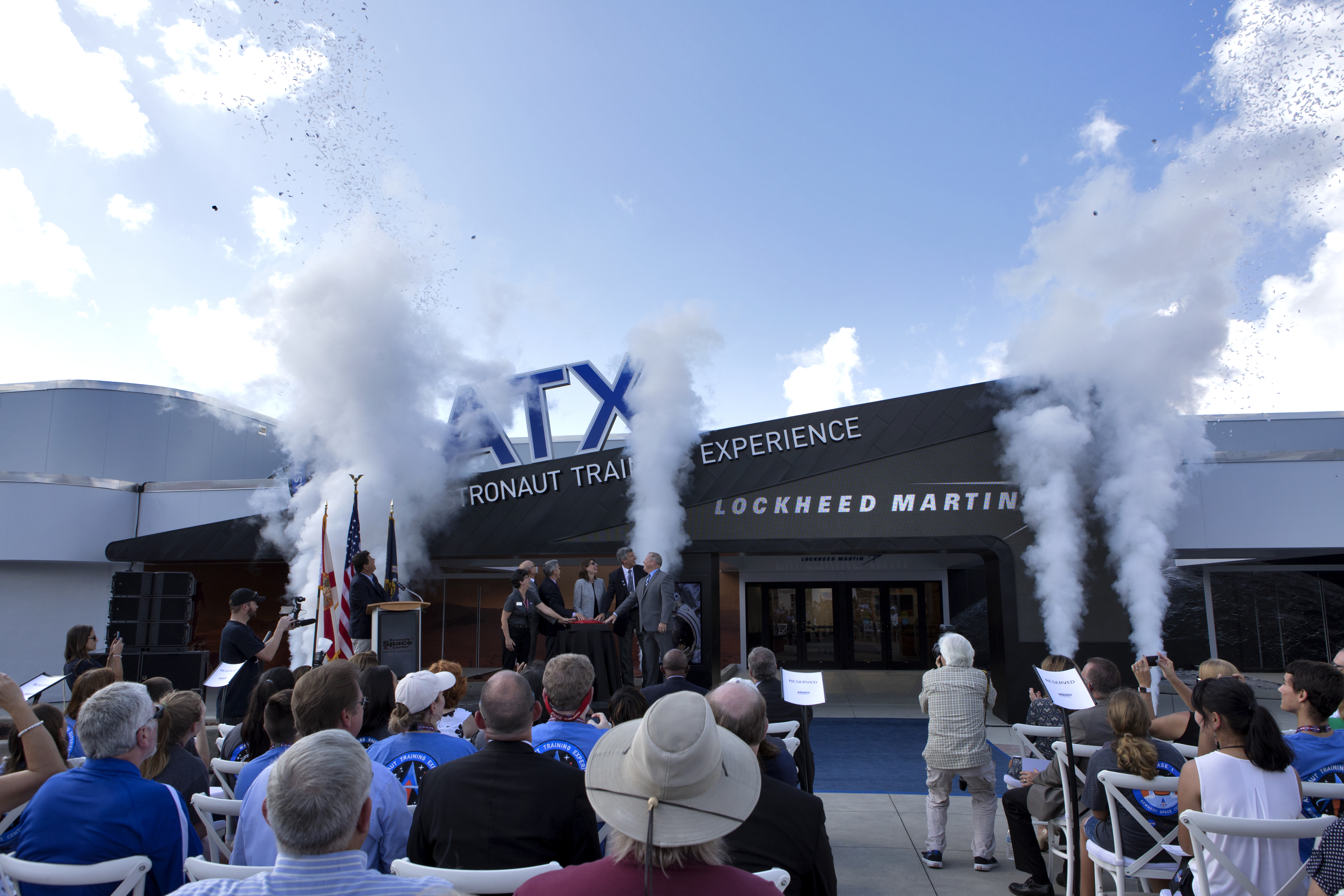 Guests cheer the opening of the new Astronaut Training Experience (ATX) at the Kennedy Space Center Visitor Complex. The ATX uses three-dimensional computer display simulation technology to "transport" participants to Mars, training them to live and work in the environment of the Red Planet. The educational experience also teaches what it’s like to travel there. The facility uses NASA science to address engineering challenges in space travel. Lockheed Martin is the title sponsor for the Astronaut Training Experience.