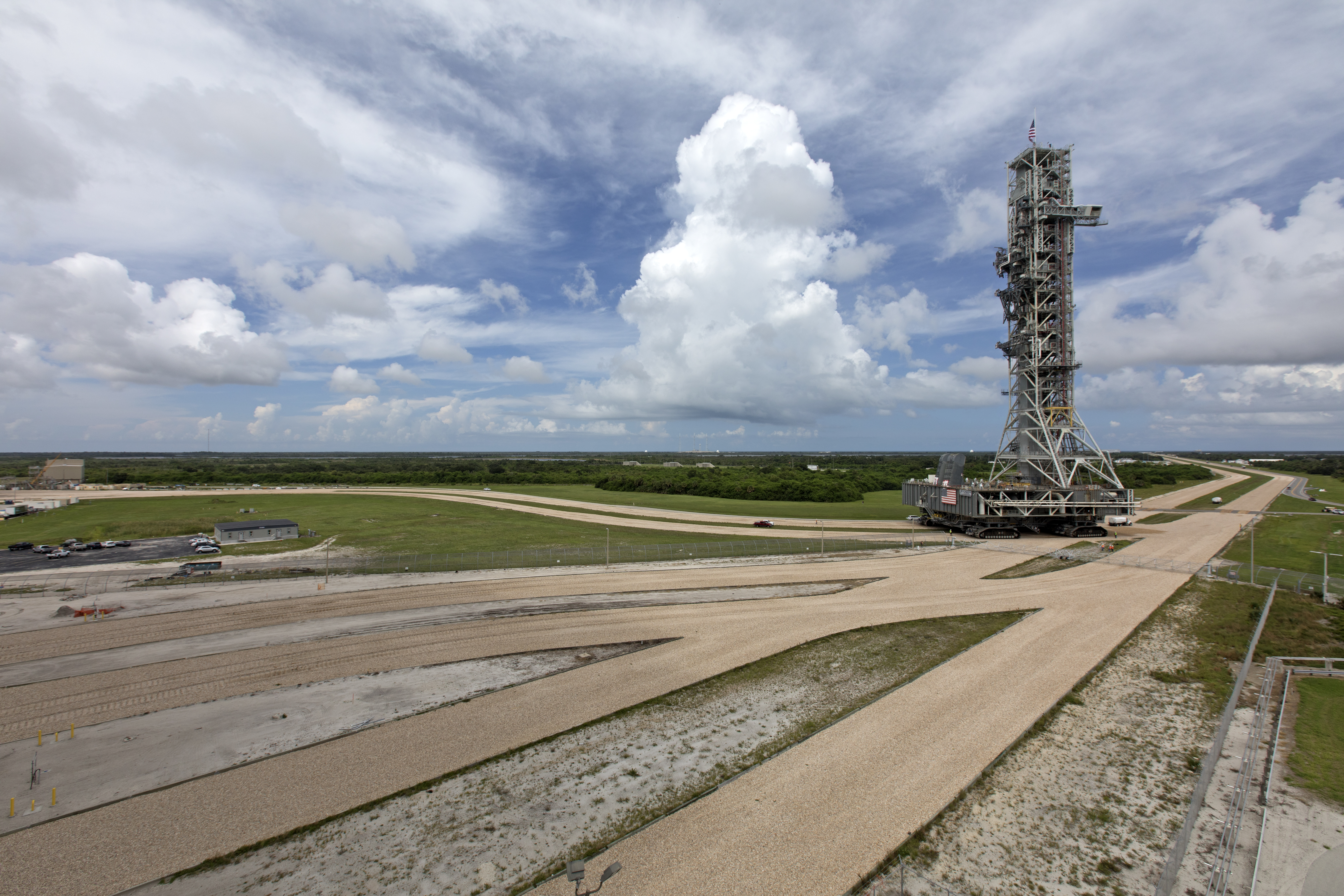NASA's mobile launcher (ML) atop crawler-transporter 2 (CT-2) moves along the crawlerway on its trek to Launch Pad 39B on Aug. 31, 2018, at the agency's Kennedy Space Center in Florida. CT-2 will move the ML up to the surface of the pad where it will undergo a fit check, followed by several days of systems testing. The 380-foot-tall mobile launcher is equipped with the crew access arm and several umbilicals that will provide power, environmental control, pneumatics, communication and electrical connections to NASA's Space Launch System (SLS) and Orion spacecraft. Exploration Ground Systems is preparing the ground systems necessary to launch SLS and Orion on Exploration Mission-1, missions to the Moon and on to Mars.