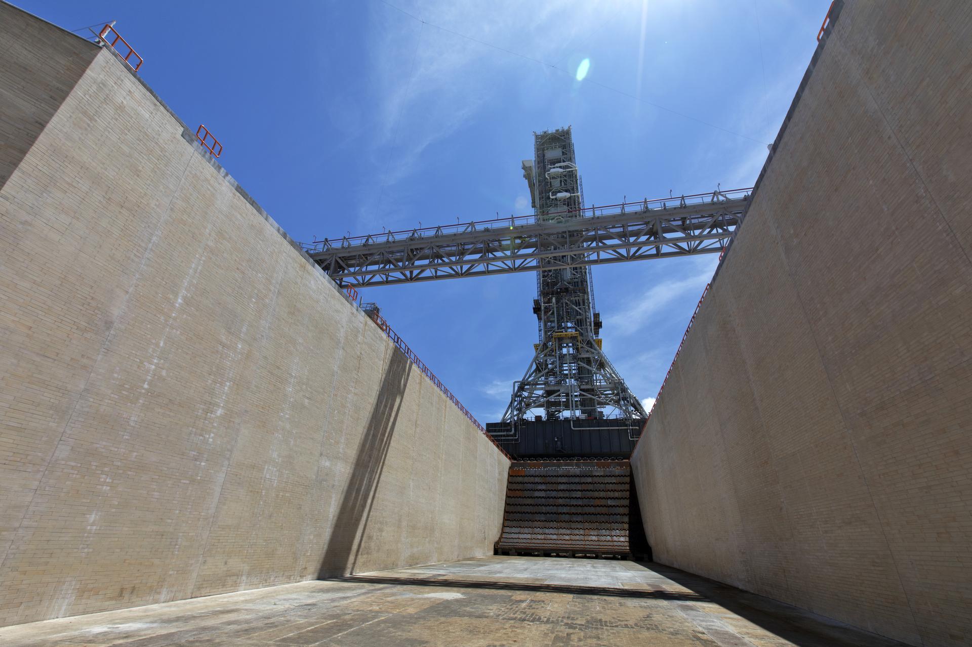 With a view of the flame trench and flame deflector below, NASA's mobile launcher (ML) atop crawler-transporter 2 arrives at Launch Pad 39B on Aug. 31, 2018, at the agency's Kennedy Space Center in Florida. The ML will undergo a fit check, followed by several days of systems testing. The 380-foot-tall mobile launcher is equipped with the crew access arm and several umbilicals that will provide power, environmental control, pneumatics, communication and electrical connections to NASA's Space Launch System (SLS) and Orion spacecraft. Exploration Ground Systems is preparing the ground systems necessary to launch SLS and Orion on Exploration Mission-1, missions to the Moon and on to Mars.