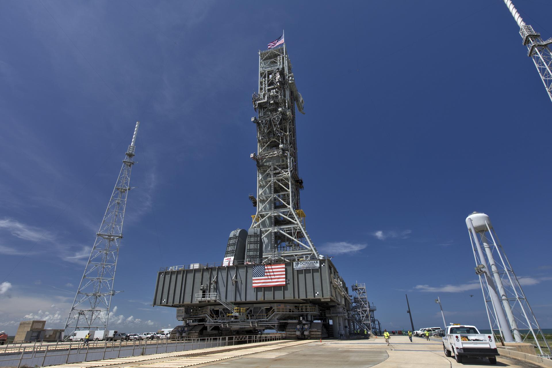 NASA's mobile launcher (ML) atop crawler-transporter 2 arrives at the top of Launch Pad 39B on Aug. 31, 2018, at the agency's Kennedy Space Center in Florida. The ML will undergo a fit check, followed by several days of systems testing. The 380-foot-tall mobile launcher is equipped with the crew access arm and several umbilicals that will provide power, environmental control, pneumatics, communication and electrical connections to NASA's Space Launch System (SLS) and Orion spacecraft. Exploration Ground Systems is preparing the ground systems necessary to launch SLS and Orion on Exploration Mission-1, missions to the Moon and on to Mars.