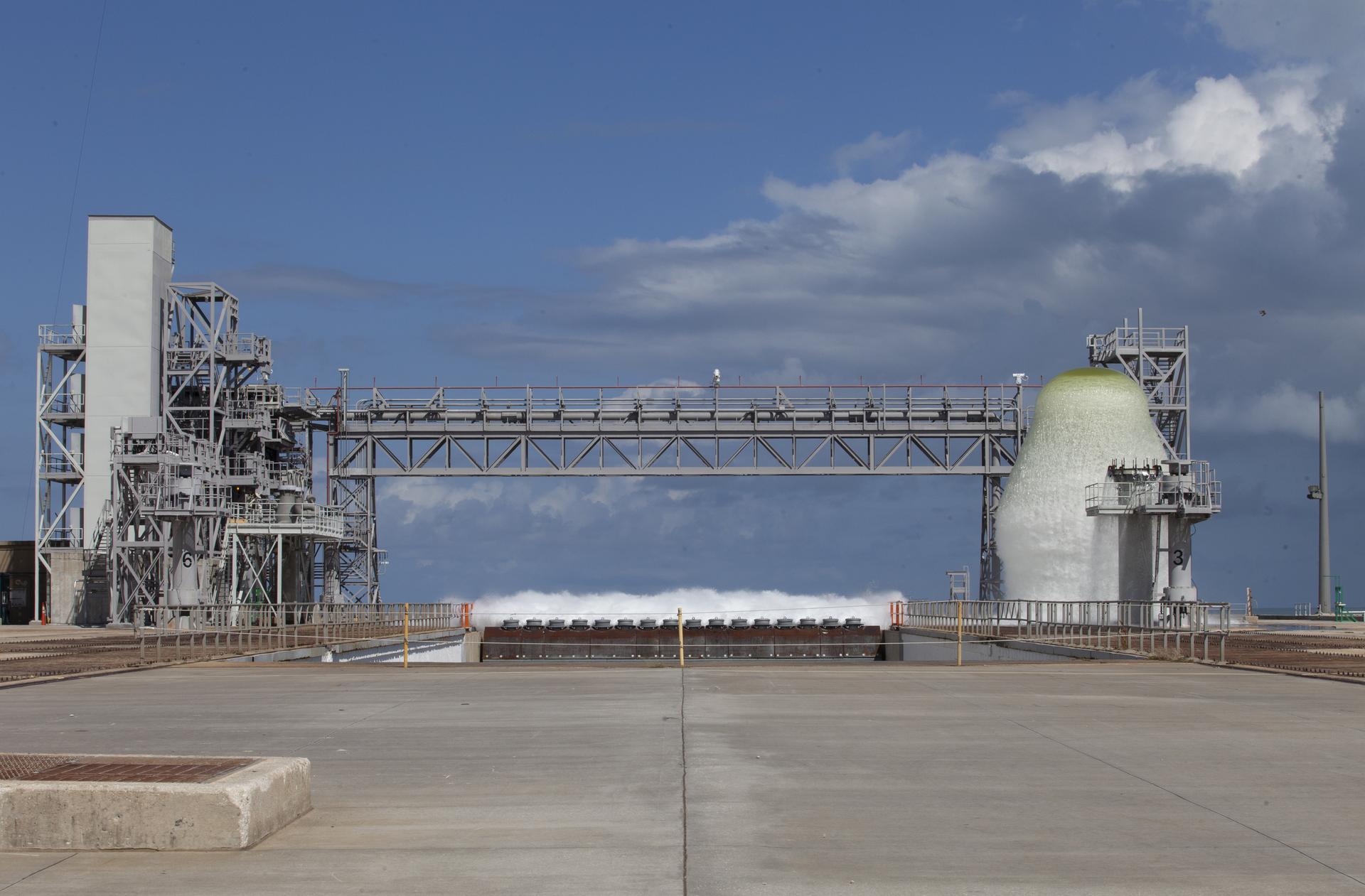 A flow test of the Ignition Overpressure Protection and Sound Suppression water deluge system is in progress at Launch Pad 39B at NASA's Kennedy Space Center in Florida, on Oct. 15, 2018. At peak flow, the water will reach about 100 feet in the air above the pad surface. It will flow at high speed from a holding tank through new and modified piping and valves, the flame trench, flame deflector nozzles and mobile launcher interface risers. The testing is part of Exploration Ground System's preparation for the new Space Launch System rocket. Modifications were made to the pad after a previous wet flow test, increasing the performance of the system. During the launch of Exploration Mission-1 and subsequent missions, this water deluge system will release about 450,000 gallons of water across the mobile launcher and Flame Deflector to reduce the extreme heat and energy generated by the rocket during ignition and liftoff.