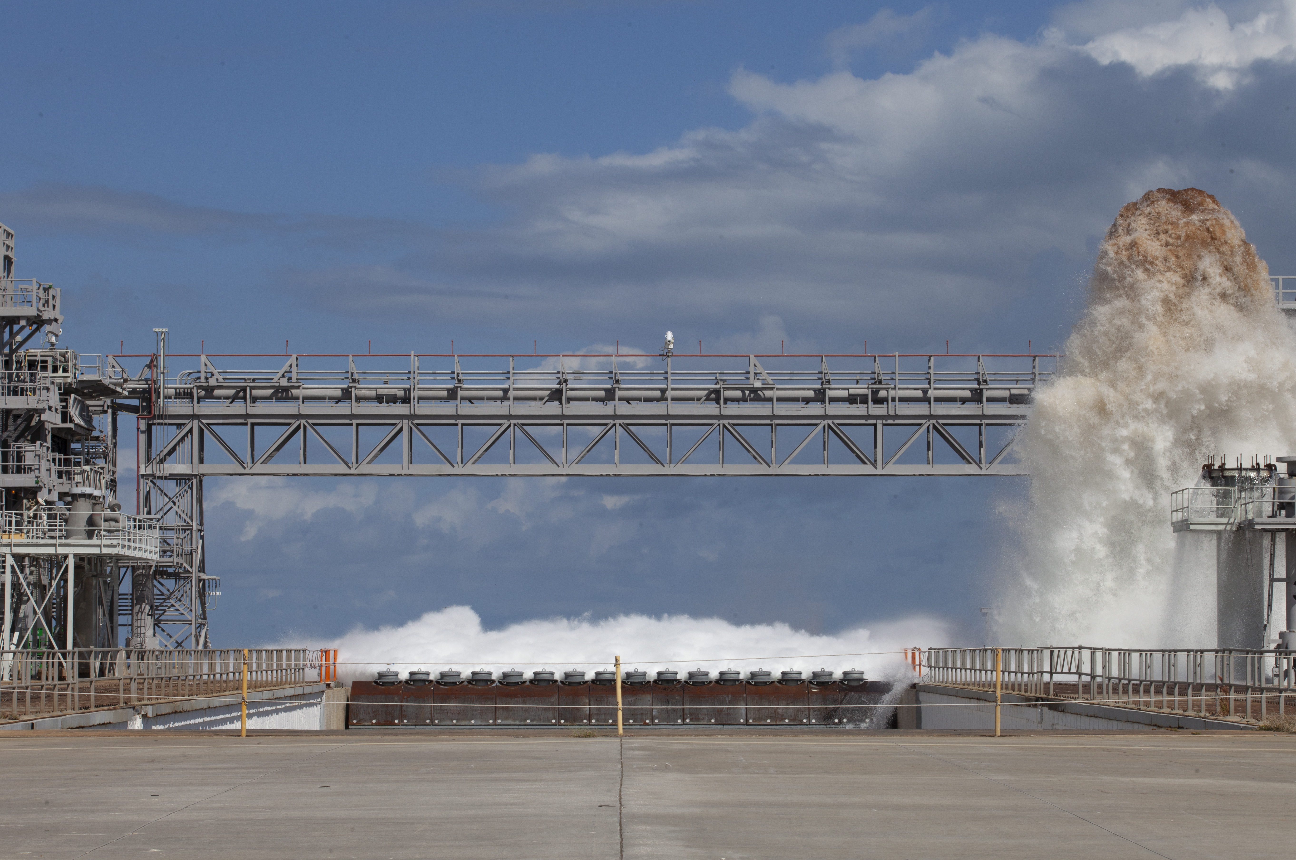 A flow test of the Ignition Overpressure Protection and Sound Suppression water deluge system is in progress at Launch Pad 39B at NASA's Kennedy Space Center in Florida, on Oct. 15, 2018. At peak flow, the water reaches about 100 feet in the air above the pad surface. It flows at high speed from a holding tank through new and modified piping and valves, the flame trench, flame deflector nozzles and mobile launcher interface risers. The testing is part of Exploration Ground System's preparation for the new Space Launch System rocket. Modifications were made to the pad after a previous wet flow test, increasing the performance of the system. During the launch of Exploration Mission-1 and subsequent missions, this water deluge system will release about 450,000 gallons of water across the mobile launcher and Flame Deflector to reduce the extreme heat and energy generated by the rocket during ignition and liftoff.