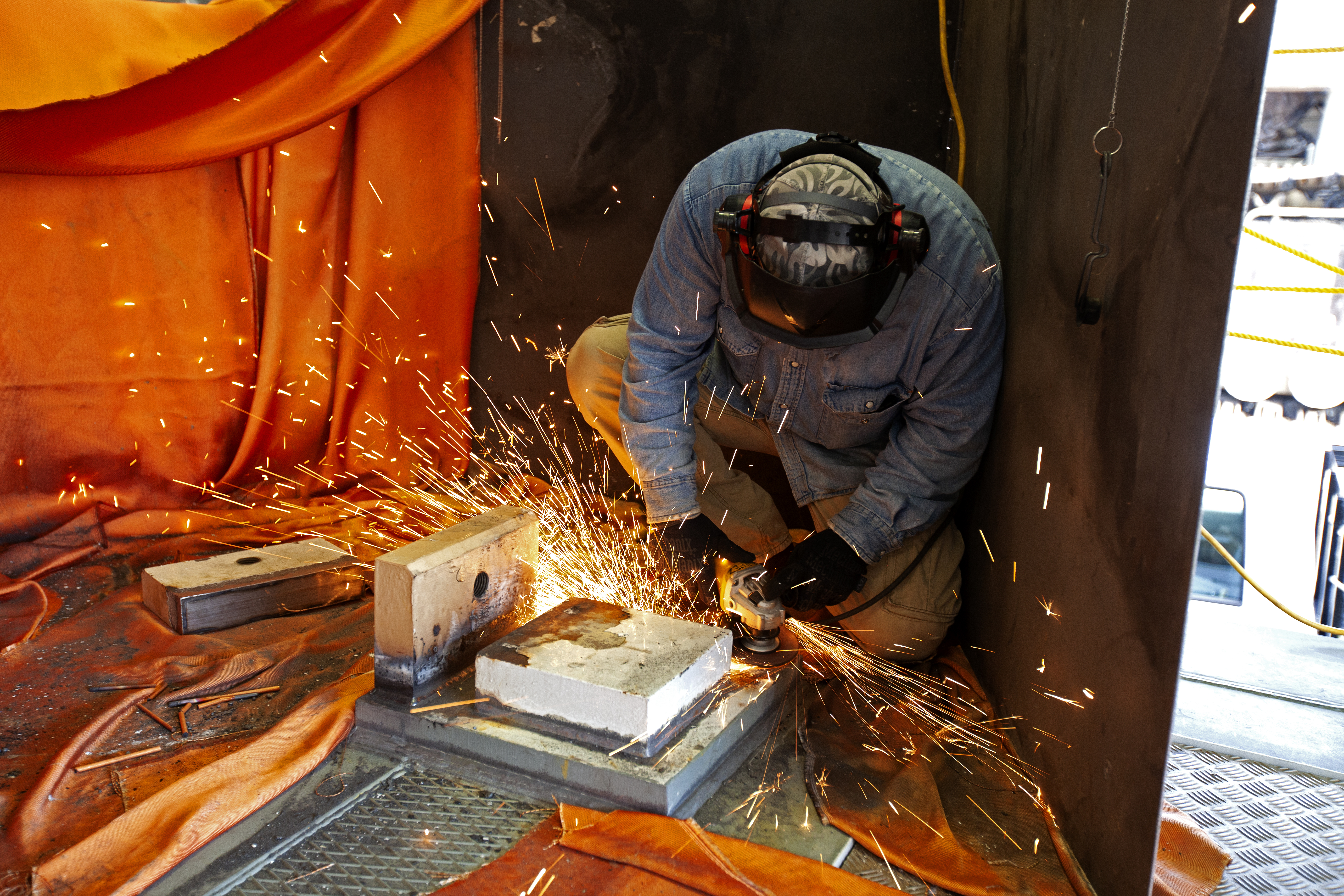 A Jacobs technician from the Launch Equipment Shop performs welding on the KAMAG spacecraft transporter on Oct. 26, 2018, inside a facility at the crawler yard at NASA’s Kennedy Space Center in Florida. The transporter is designed to carry heavy loads. Welding is being performed on the attach points that will hold the Orion transportation pallet in place. Testing of the pallet will be performed to support validation and verification of the attach fittings in the Multi-Payload Processing Facility.