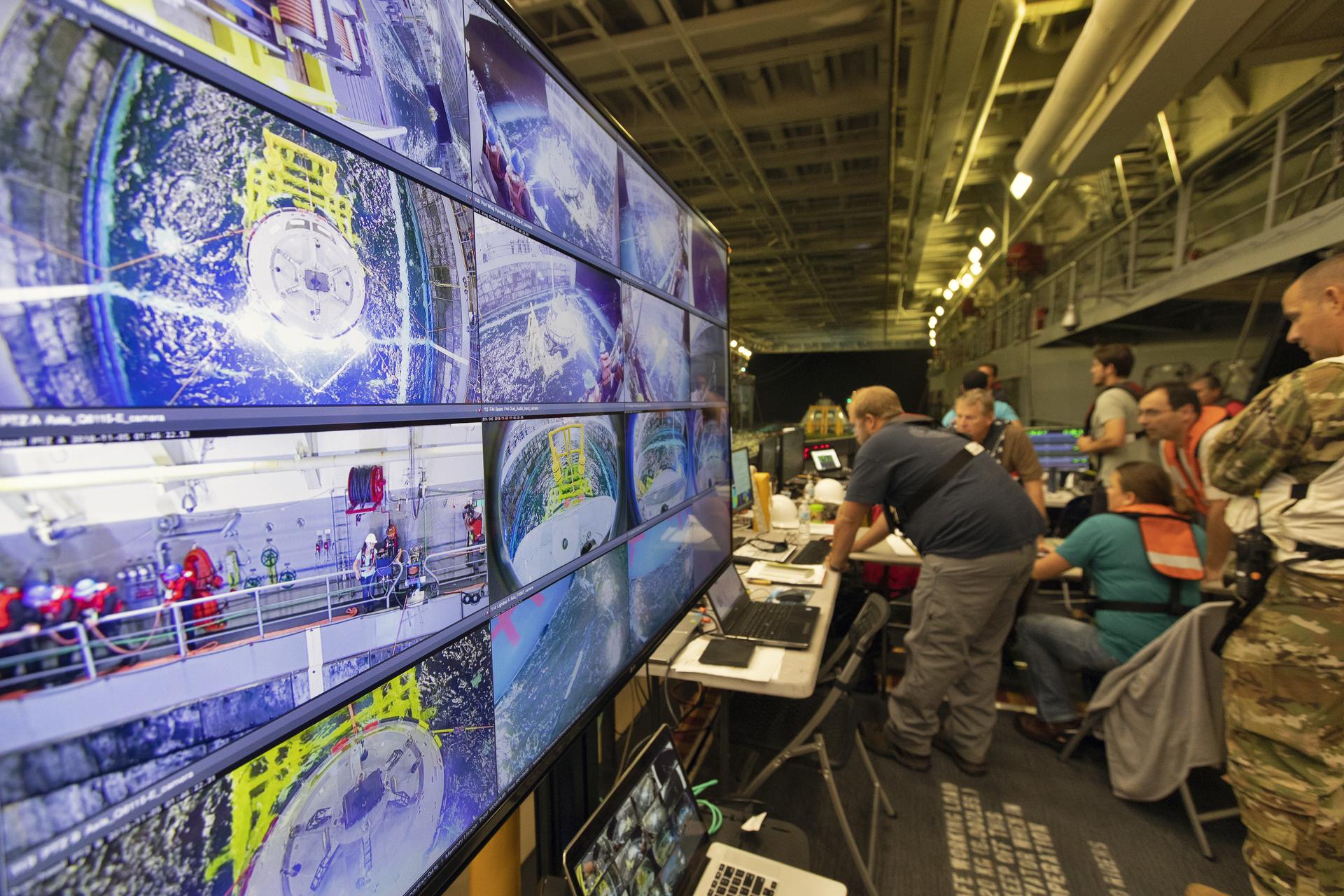 NASA Recovery Team members and wave trackers monitor recovery of a test version of the Orion crew module inside the USS John P. Murtha, during Underway Recovery Test (URT-7) on Nov. 4 2018. URT-7 is one in a series of tests conducted by the Exploration Ground Systems Recovery Team to verify and validate procedures and hardware that will be used to recover the Orion spacecraft after it splashes down in the Pacific Ocean following deep space exploration missions. Orion will have emergency abort capability, sustain the crew during space travel and provide safe re-entry from deep space return velocities.