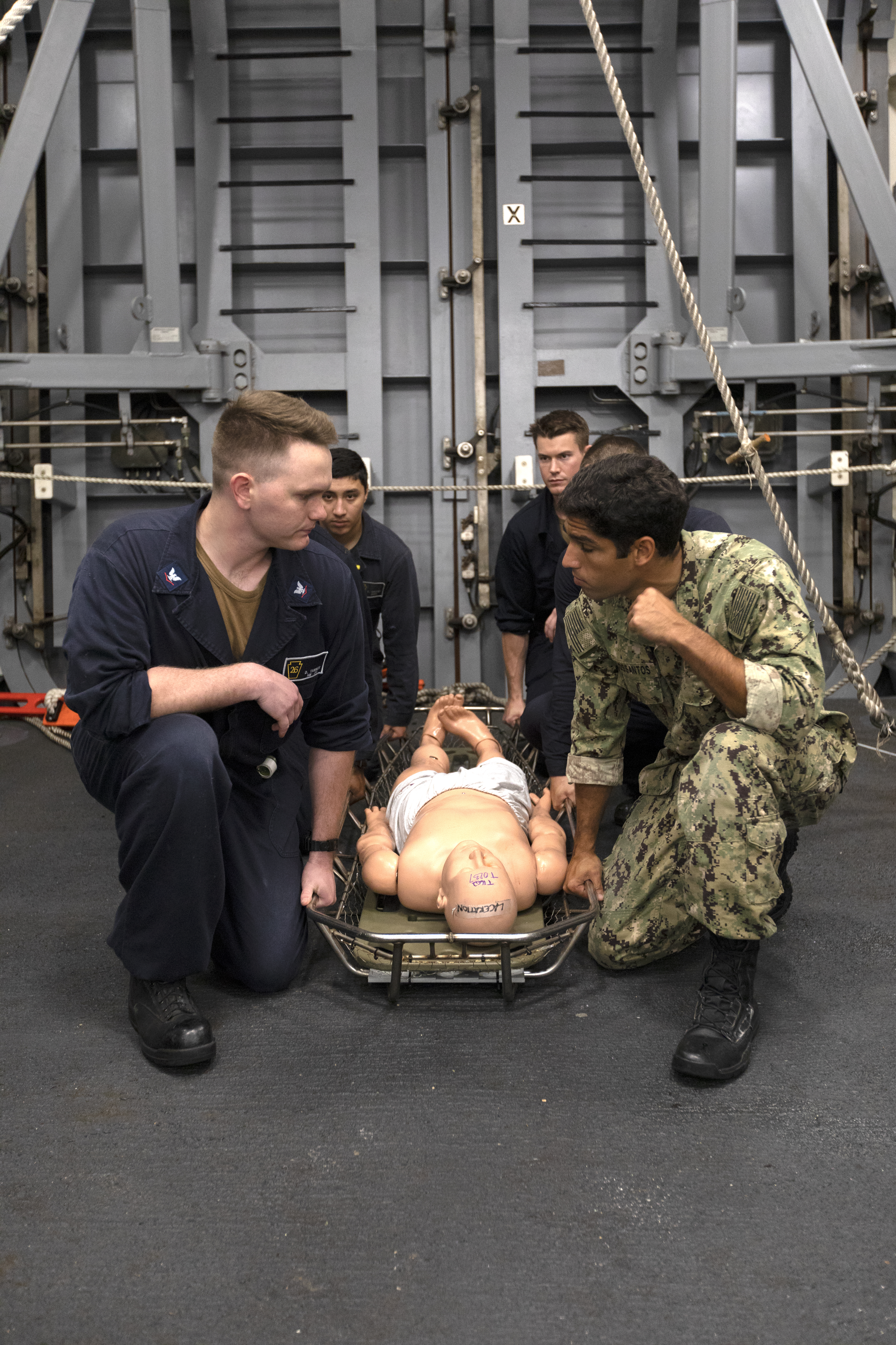 U.S. Navy recovery team members practice bringing an astronaut aboard the USS John P. Murtha, using a dummy, during Underway Recovery Test-7 (URT-7) on Nov. 5, 2018. NASA's Recovery Team, along with the U.S. Navy, are practicing recovery of a test version of the Orion in the Pacific Ocean. URT-7 is one in a series of tests to verify and validate procedures and hardware that will be used to recover the Orion spacecraft after it splashes down in the Pacific Ocean following deep space exploration missions. Orion will have emergency abort capability, sustain the crew during space travel and provide safe re-entry from deep space return velocities.