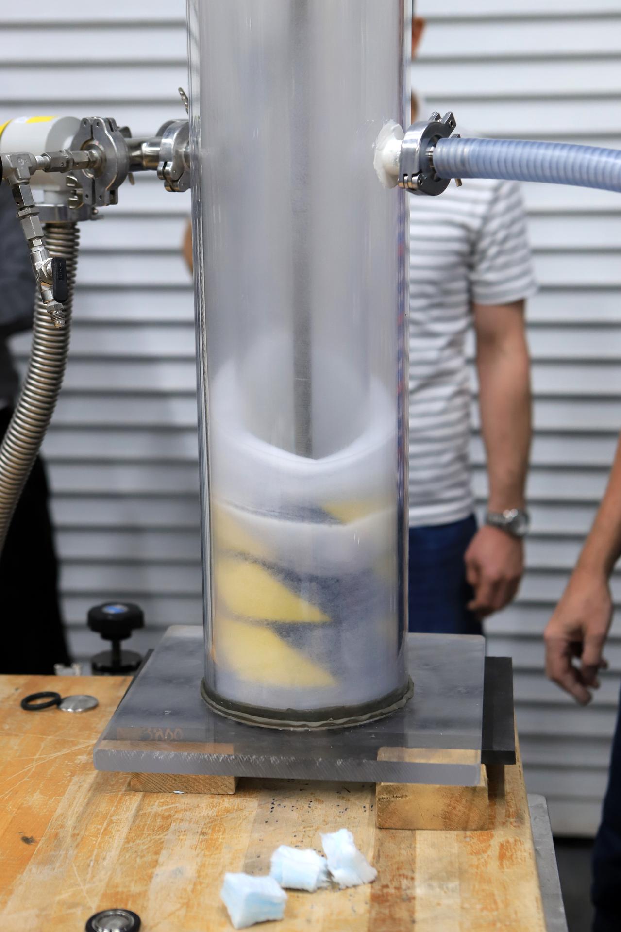 Workers attend a cryogenic insulation training session on Nov. 6, 2018, at the Cryogenics Laboratory at NASA's Kennedy Space Center in Florida. The training is for personnel who will be working to insulate pipes on the mobile launcher (ML). The ML is equipped with cryogenic fluid lines that will deliver hydrogen and oxygen to NASA's Space Launch System rocket. The lines must be kept well-insulated to maintain temperatures cold enough to keep fluids in a liquid state. In a new process, workers are learning how to pack spaces between pipes with aerogel granules in the same manner as they will on the ML.