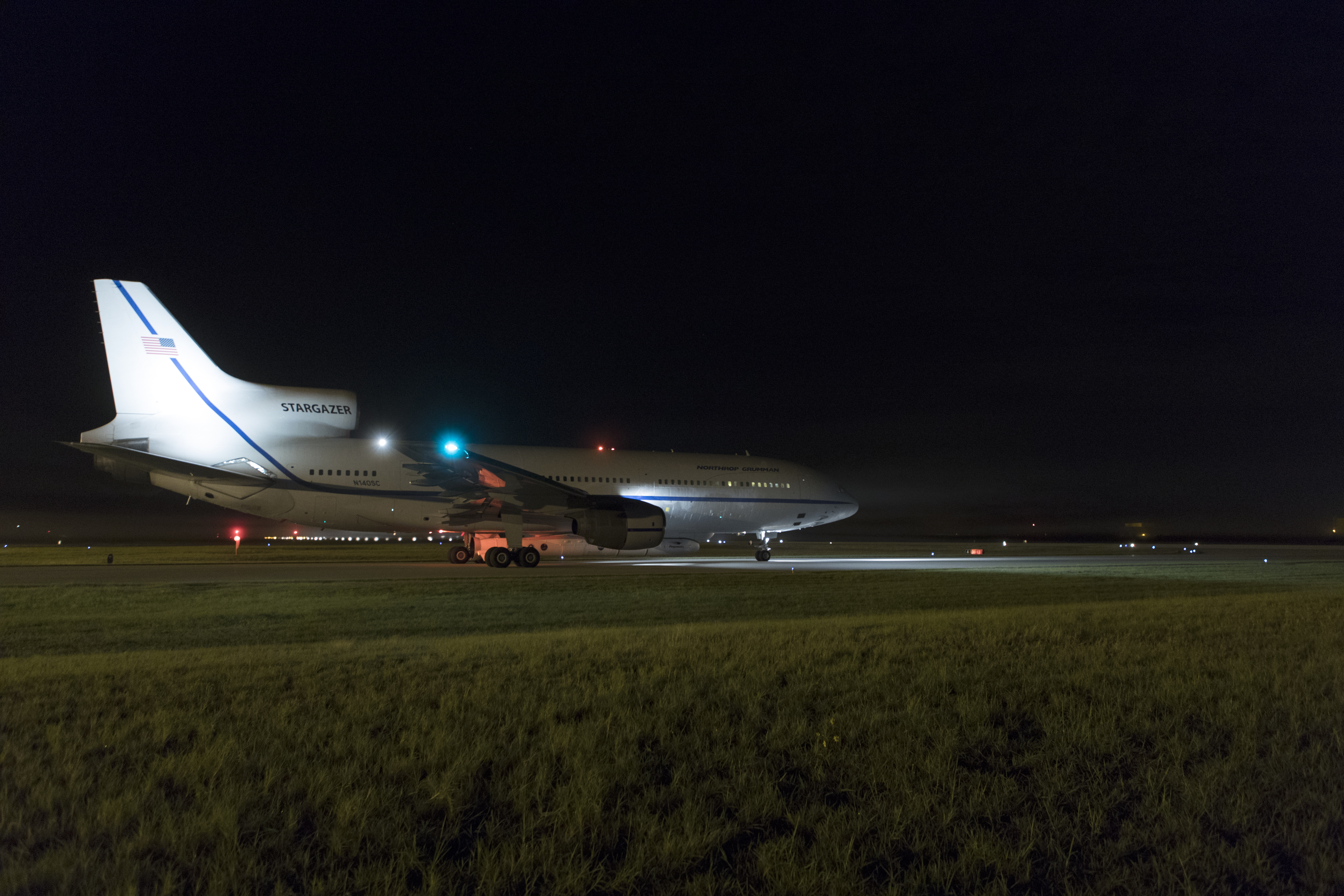 The Northrop Grumman L-1011 Stargazer aircraft, with the Pegasus XL rocket attached beneath, starts down the runway at the Skid Strip at Cape Canaveral Air Force Station in Florida on Nov. 7, 2018. NASA's Ionospheric Connection Explorer (ICON) is secured inside the rocket's payload fairing. The Pegasus XL rocket will be carried aloft by the Stargazer. ICON will study the frontier of space - the dynamic zone high in Earth's atmosphere where terrestrial weather from below meets space weather above. The explorer will help determine the physics of Earth's space environment and pave the way for mitigating its effects on our technology, communications systems and society.