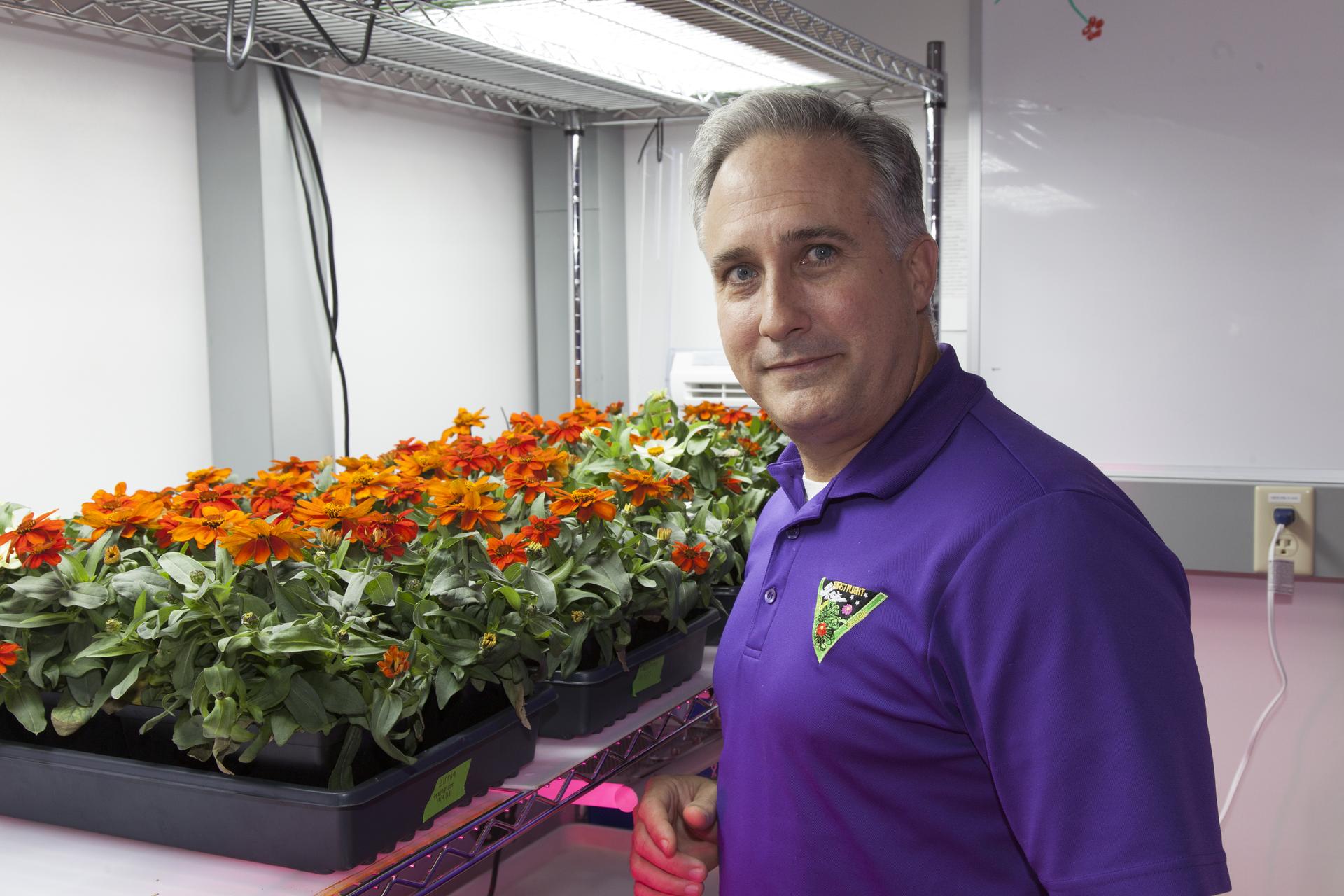 Trent Smith, Veggie project manager, Exploration Research and Technology Programs, is in the Veggie Laboratory in the Space Station Processing Facility (SSPF) at NASA's Kennedy Space Center in Florida on Nov. 27, 2018. Next to him are zinnia flowers grown from seeds germinated in the Veggie plant growth system on the International Space Station. The seeds were returned to Earth and researchers in the SSPF planted them in the Veggie control unit and grew the colorful flowers.