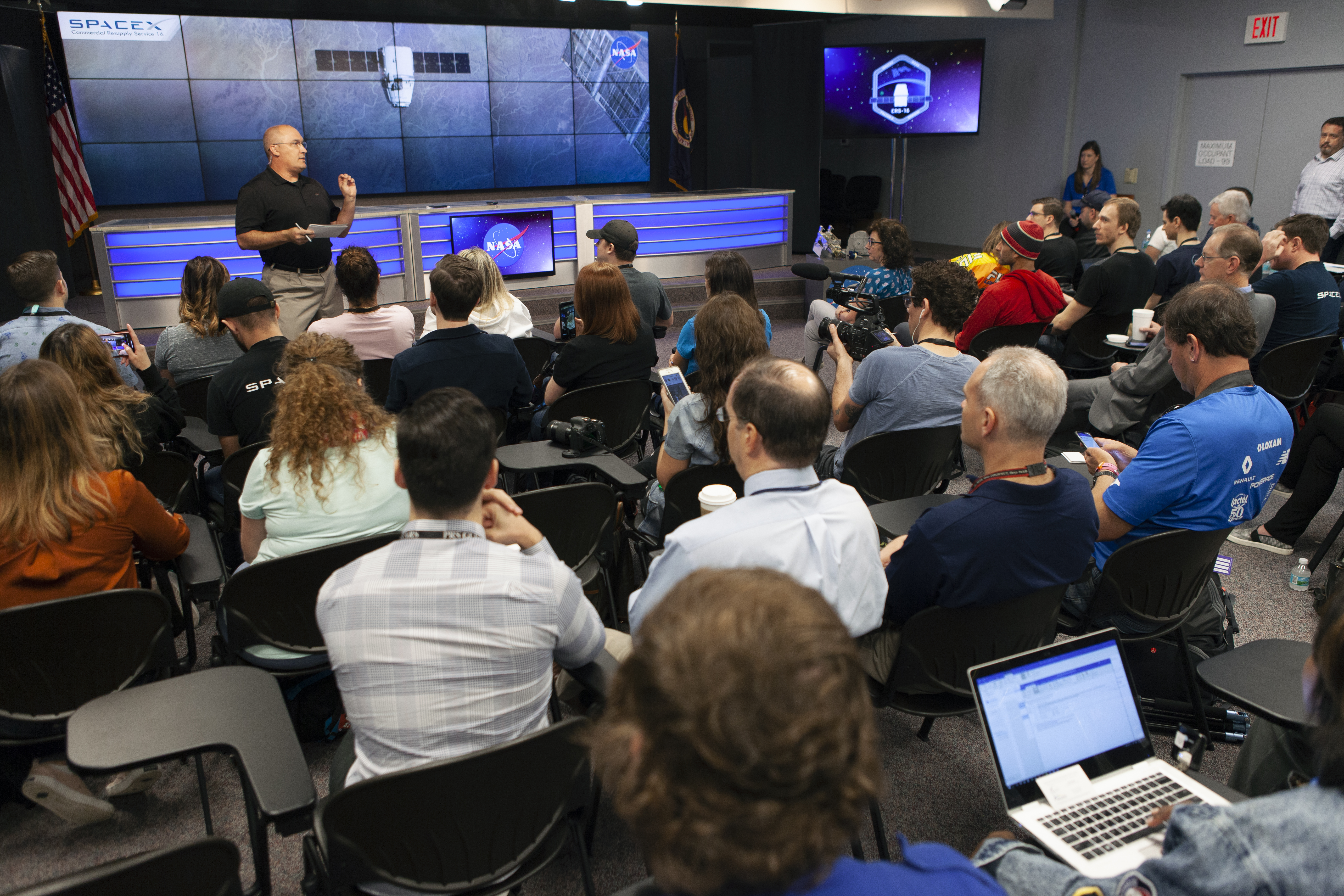 Greg Harland of NASA Communications speaks to members of the media in the Kennedy Space Center’s Press Site auditorium. The briefing focused on research planned for launch to the International Space Station. The scientific materials and supplies will be aboard a Dragon spacecraft scheduled for liftoff from Cape Canaveral Air Force Station's Space Launch Complex 40. The SpaceX Falcon 9 rocket will launch the company's 16th Commercial Resupply Services mission to the space station.
