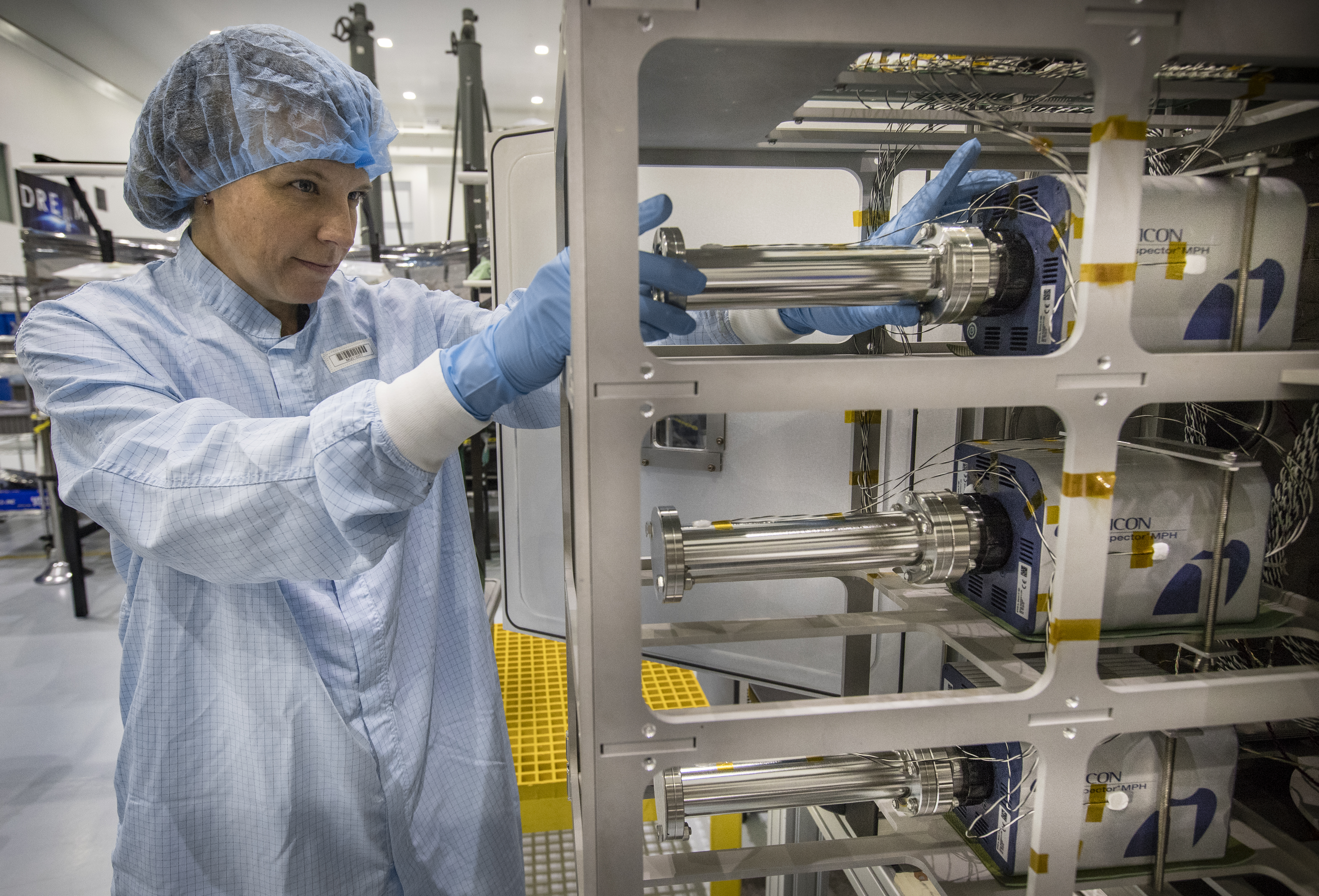 Principal investigator, Dr. Janine Captain, attaches a mass spectrometer sensor to electronics inside a vacuum chamber in the Space Station Processing Facility high bay at NASA’s Kennedy Space Center on Dec. 12, 2018. The Mass Spectrometer observing lunar operations (MSolo) instrument is a commercial off-the-shelf mass instrument modified to work in space, and can identify molecules at lunar landing sites. These MSolo instruments are part of NASA’s efforts to return to the Moon with the Commercial Lunar Payload Services Landers Program.