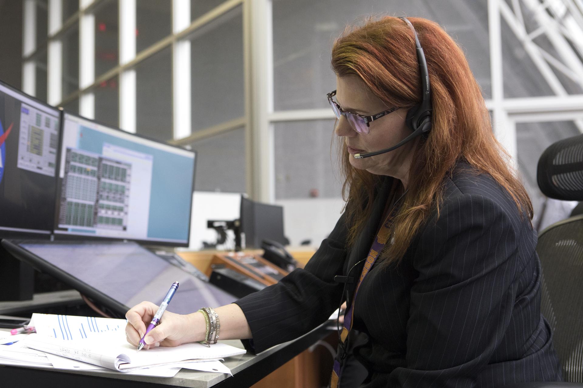 NASA Launch Director Charlie Blackwell-Thompson makes notes at her console in Firing Room 1 at the Kennedy Space Center's Launch Control Center during a terminal countdown demonstration for Exploration Mission 1, or EM-1. The launch will be the first integrated test of the Space Launch System rocket and Orion spacecraft that will eventually take astronauts beyond low-Earth orbit to destinations such as the Moon and Mars. Taking place on Dec. 14, 2018, the countdown demonstration was intended to validate the launch team's capability to perform an EM-1 countdown and respond to challenges put into the system for practice.