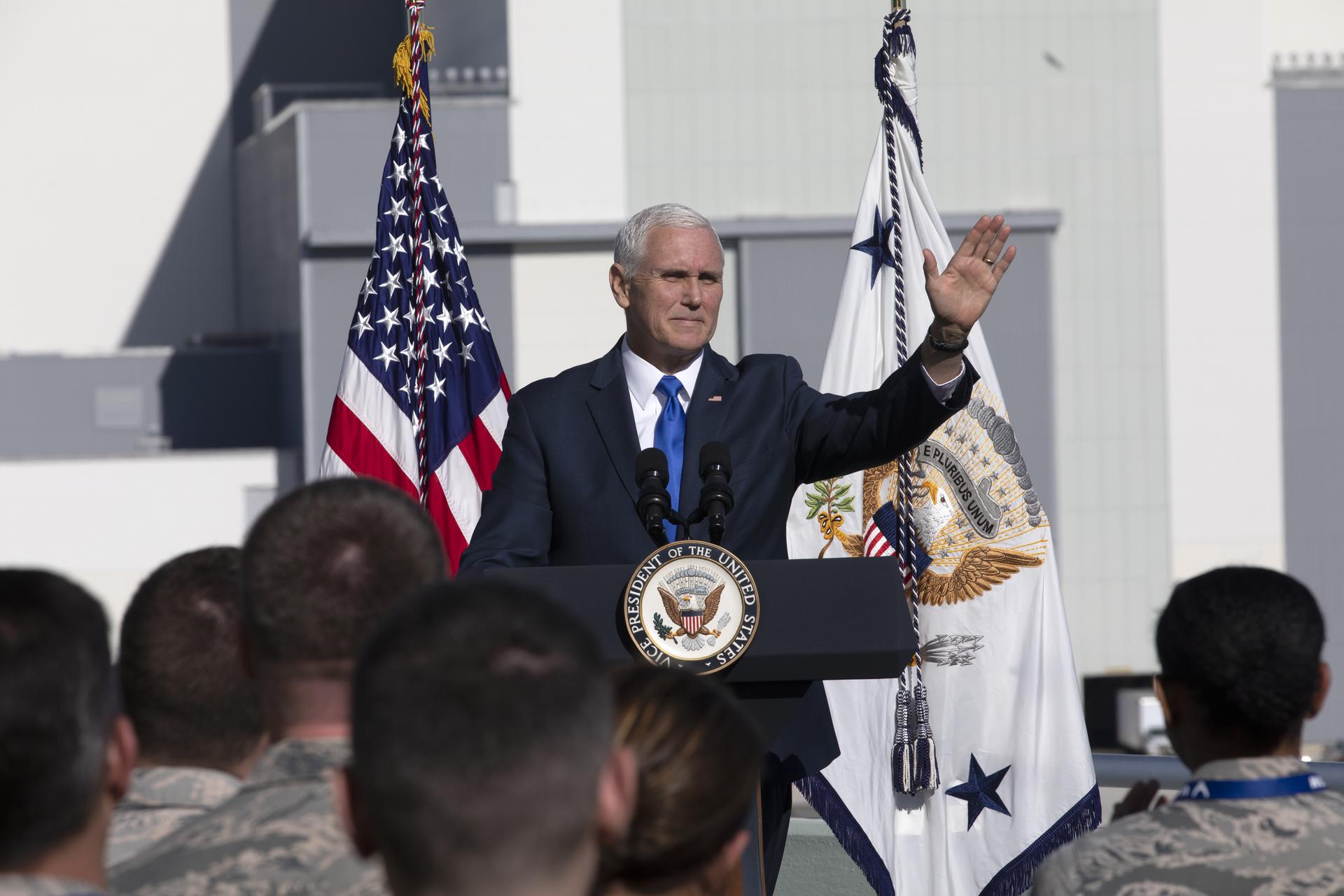 At the Operations and Support Building II at NASA's Kennedy Space Center in Florida, Vice President Mike Pence addresses members of the U.S. Air Force after the scrubbed launch attempt of SpaceX's Falcon 9 rocket carrying the Air Force's GPS III satellite from Space Launch Complex 40 on Cape Canaveral Air Force Station on Dec. 18, 2018.