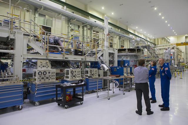 Inside the Operations and Checkout Building high bay at NASA’s Kennedy Space Center in Florida, astronaut candidate Kayla Barron, second from left, and NASA astronaut Randy Bresnik, at right, view the Crew Module for Orion’s Exploration Mission-1 on Feb. 12, 2019.