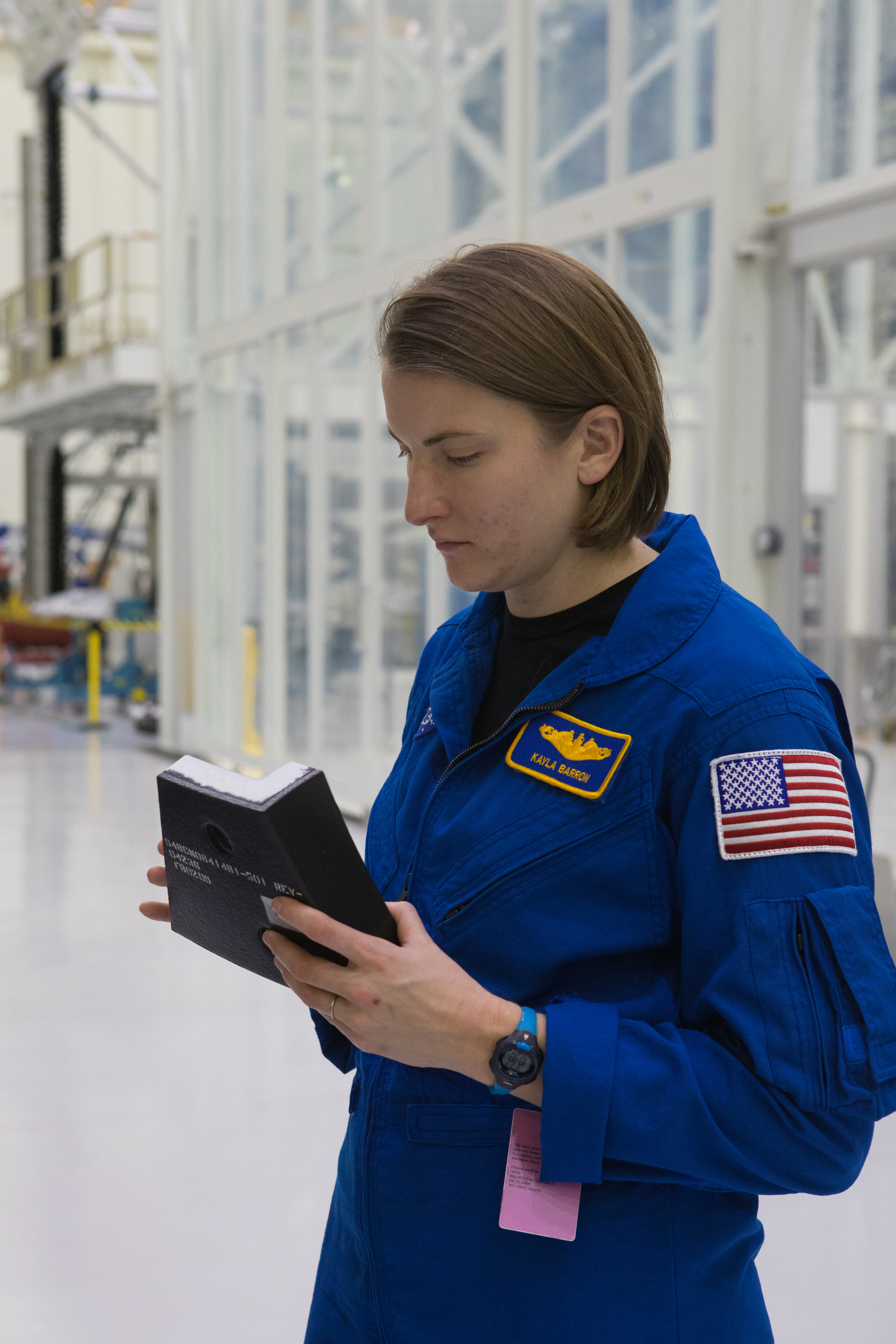 Astronaut candidate Kayla Barron examines a heat-resistant tile sample inside the Operations and Checkout Building high bay at NASA’s Kennedy Space Center in Florida during a tour on Feb. 12, 2019. Barron also viewed additional spaceflight hardware being processed for Exploration Mission-1 and Exploration Mission-2.