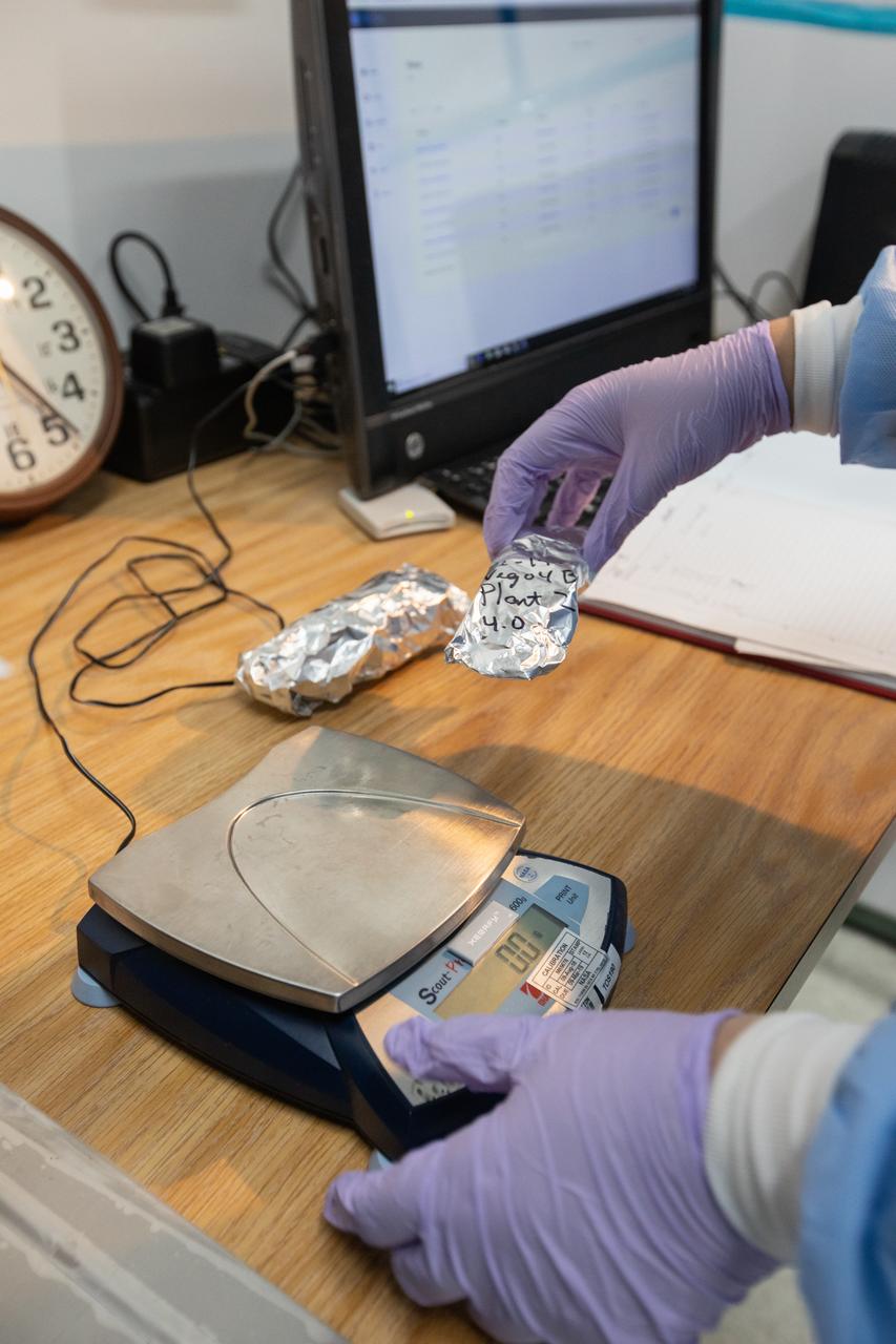 Gretchen Maldonado Vazquez, a microbiologist, weighs the harvest of mizuna mustard inside the Veggie harvest chamber in the Space Station Processing Facility at NASA’s Kennedy Space Center in Florida on Feb. 19, 2019, from the Experiment Verification Test for the VEG-04B mission that will launch to the International Space Station later this year. VEG-04B examines the interactions between light and spaceflight by growing plants under two different LED lighting conditions, and a similar harvest will be conducted on the space station after a grow-out duration of 56 days. Ultimately, fresh vegetables grown in space will be an essential supplement to the crew’s pre-packaged diet, prepping them for long-duration space exploration.
