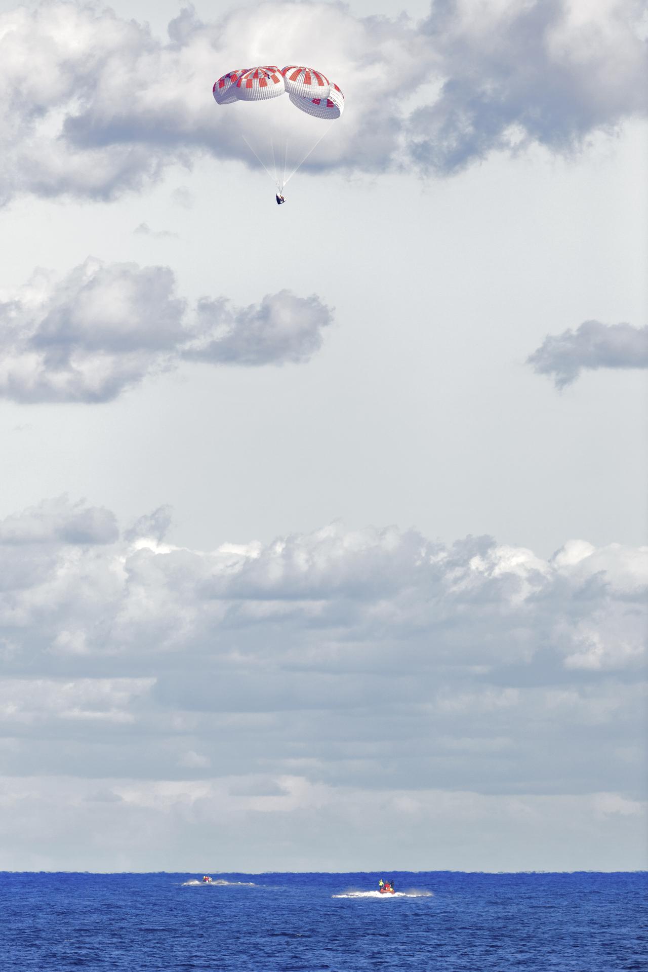 SpaceX’s Crew Dragon is guided by four parachutes toward the Atlantic Ocean on March 8, 2019, after returning from the International Space Station on the Demo-1 mission. The uncrewed spacecraft docked to the orbiting laboratory on March 3, following a 2:49 a.m. EST liftoff aboard a SpaceX Falcon 9 rocket from Launch Complex 39A at NASA’s Kennedy Space Center in Florida on March 2. Crew Dragon made 18 orbits of Earth before successfully attaching to the space station. The spacecraft undocked at 2:32 a.m., March 8, splashing down in the Atlantic Ocean, about 200 miles off Florida’s east coast at 8:45 a.m. SpaceX’s inaugural flight with NASA’s Commercial Crew Program is the first flight test of a space system designed for humans built and operated by a commercial company through a public-private partnership. NASA and SpaceX will use data from Demo-1 to further prepare for Demo-2, the crewed flight test that will carry NASA astronauts Bob Behnken and Doug Hurley to the International Space Station later this year.