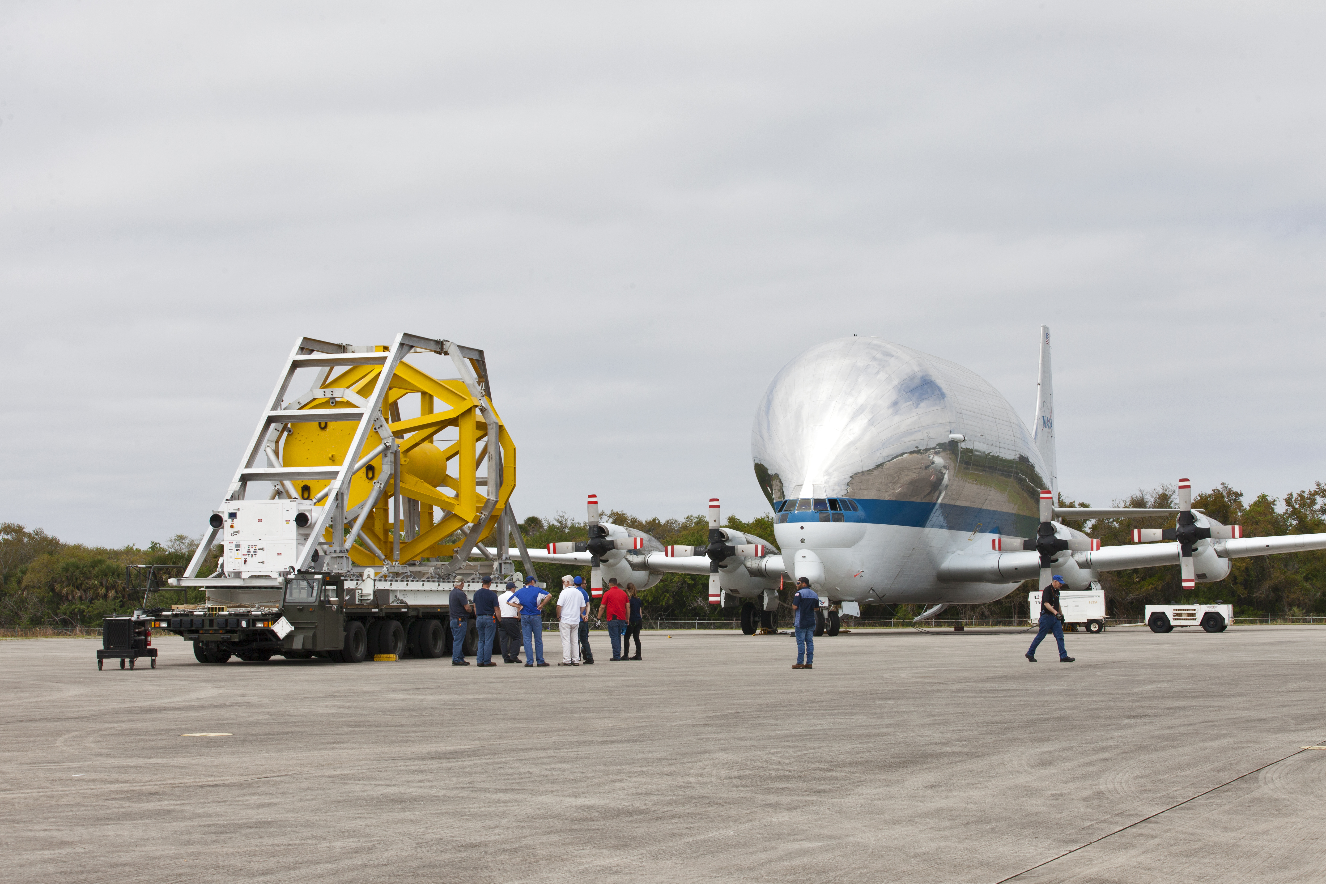 A fit check of the Orion Crew and Service Module Horizontal Transporter (CHT) with NASA's Super Guppy aircraft began March 12, 2019, at NASA Kennedy Space Center’s Shuttle Landing Facility in Florida, operated by Space Florida. In this photo, the CHT is secured on the U.S. Air Force aircraft loader. The fit check is being performed to confirm loading operations, ensure that the CHT fits inside the Super Guppy and test the electrical interface to aircraft power. The Orion crew and service modules will be readied for a trip to NASA’s Plum Brook Station in Sandusky, Ohio, for full thermal vacuum testing. In this unique facility, the crew and service modules will be put through extensive testing to ensure they can survive the rigors of launch, space travel, re-entry and splashdown. The Orion spacecraft will launch atop the agency's Space Launch System rocket on Exploration Mission-1.