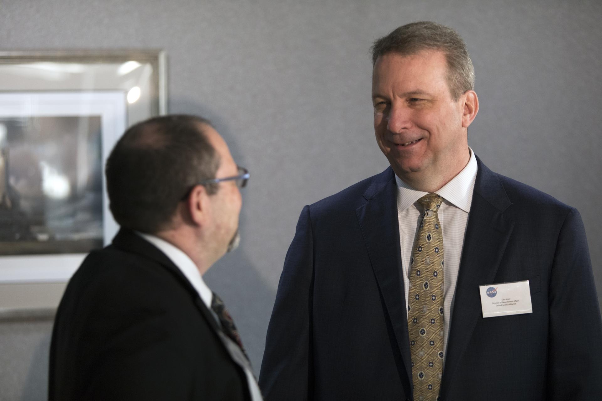 Multi-user spaceport partners converse prior to a roundtable discussion with U.S. Sen. Rick Scott and Kennedy Space Center Director Bob Cabana at Kennedy’s Saturn V Conference Center on March 15, 2019. The meeting was held to discuss the needs of the space center and Cape Canaveral Air Force Station.