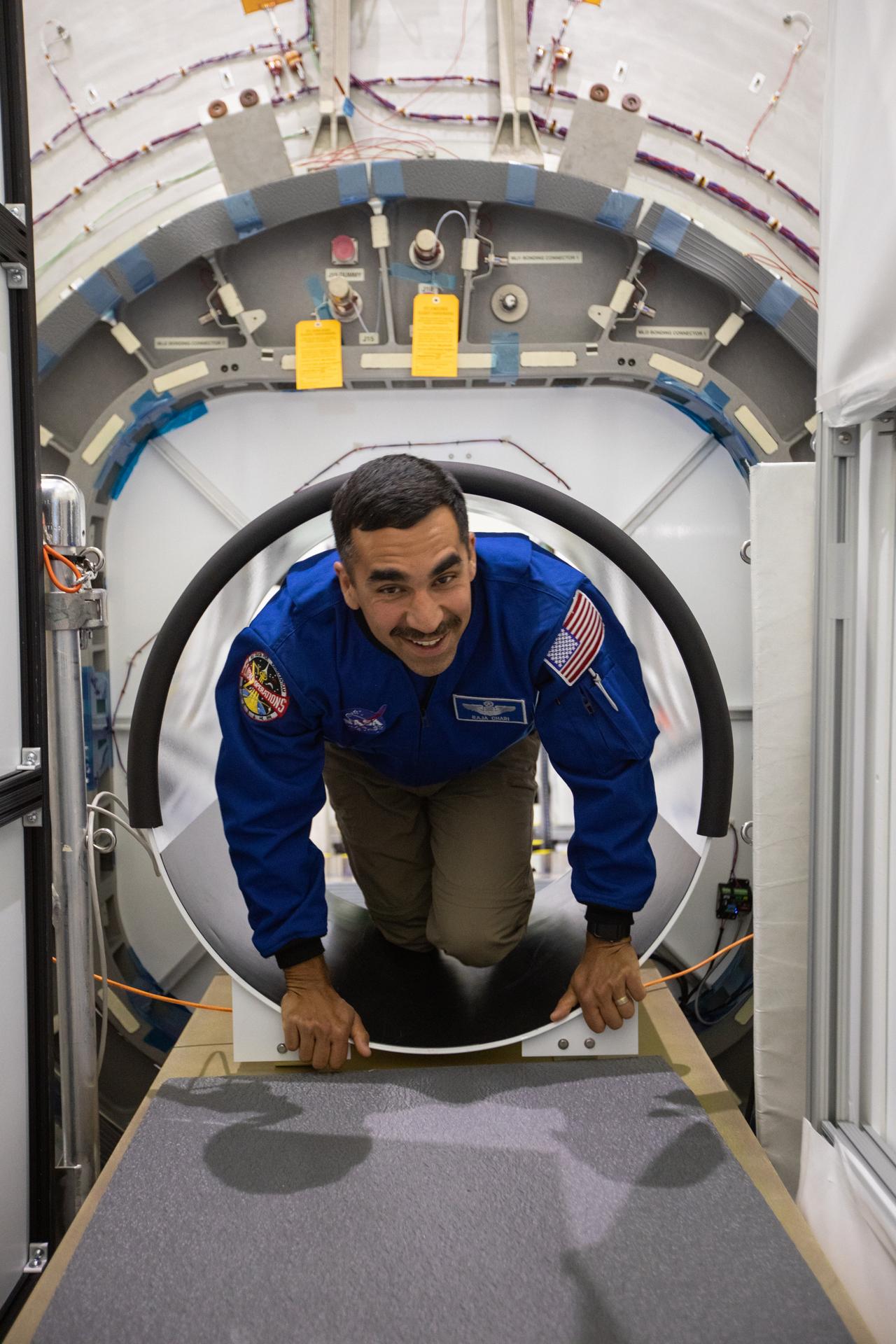 NASA astronaut Raja Chari climbs through a hatch of Lockheed Martin’s deep space habitat ground prototype at NASA’s Kennedy Space Center in Florida on March 25, 2019. Chari is one of the astronauts helping engineers refine requirements for the design of an American-made deep space habitat for the Gateway. Astronauts provide important design perspective as they may one day live and work aboard the lunar outpost, which would be located about 250,000 miles from Earth. To date, five habitat prototypes have been developed through NASA’s Next Space Exploration for Technologies Partnerships, or NextSTEP. Lockheed Martin was the first to turn their habitat over to NASA for testing. Ground prototypes developed by Bigelow Aerospace, Boeing, Northrop Grumman and Sierra Nevada Corporation will be tested in the future at various facilities across the country. A sixth company, NanoRacks, plans to develop a prototype as well.