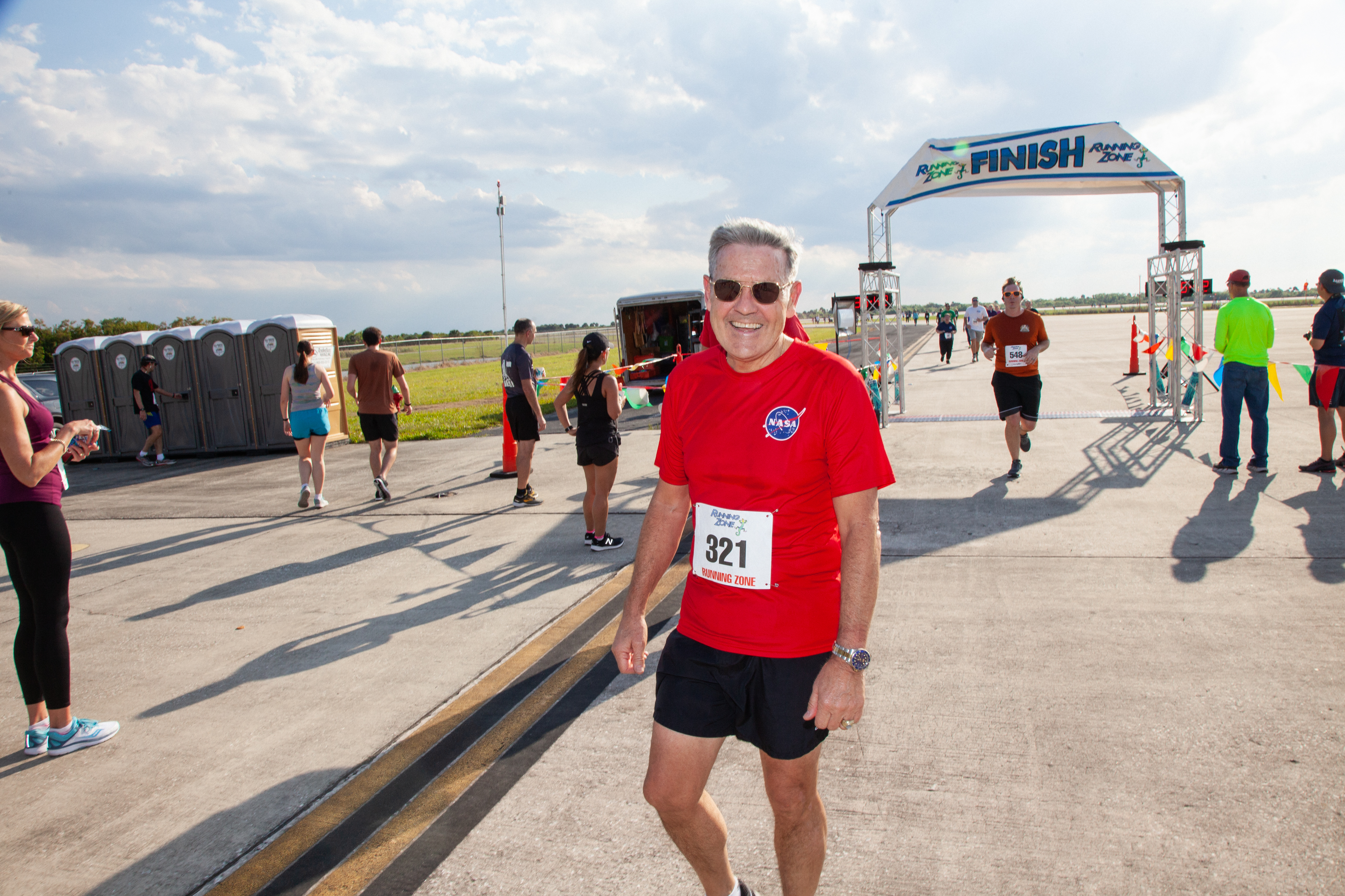 Kennedy Space Center Director Bob Cabana poses after crossing the finish line of the KSC Walk Run on March 26, 2019. Part of Kennedy’s Safety and Health Days, the annual event takes place at the Florida spaceport’s Shuttle Landing Facility runway and offers employees and guests the chance to partake in a two-mile walk or run, a 5K or a 10K.