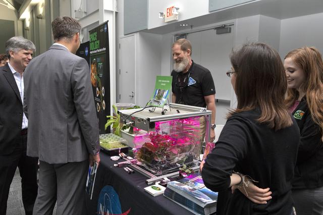 Guests visit with a representative from Exploration Research and Technology during NASA Kennedy Space Center Director Bob Cabana’s update to community leaders, business executives, partners, educators and government leaders March 29, 2019, at the Kennedy Space Center Visitor Complex in Florida. Cabana’s presentation covered recent accomplishments and future plans for Kennedy-led programs, including the Commercial Crew Program, Exploration Ground Systems, Launch Services Program, Exploration Research and Technology, and Center Planning and Development. After the presentation, guests had the opportunity to ask questions and visit displays from the programs and some of the commercial partners.