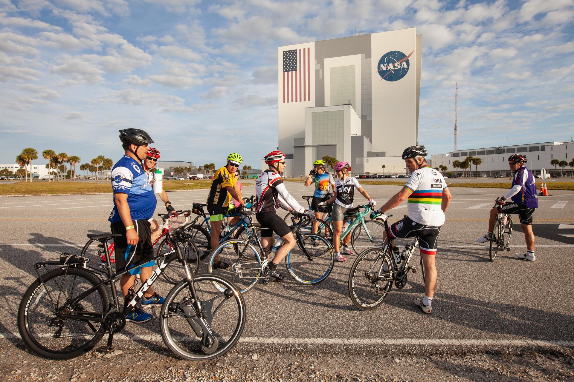 Cyclists pause in front of the Vehicle Assembly Building (VAB) to rest during Kennedy Space Center’s annual Tour de KSC. The bicycle tour took place March 30, giving Kennedy employees and guests the opportunity to choose from three different routes that ranged from seven to 33 miles along some of the Florida spaceport’s most notable facilities such as the VAB, the Shuttle Landing Facility and historic Launch Pad 39A, among others.
