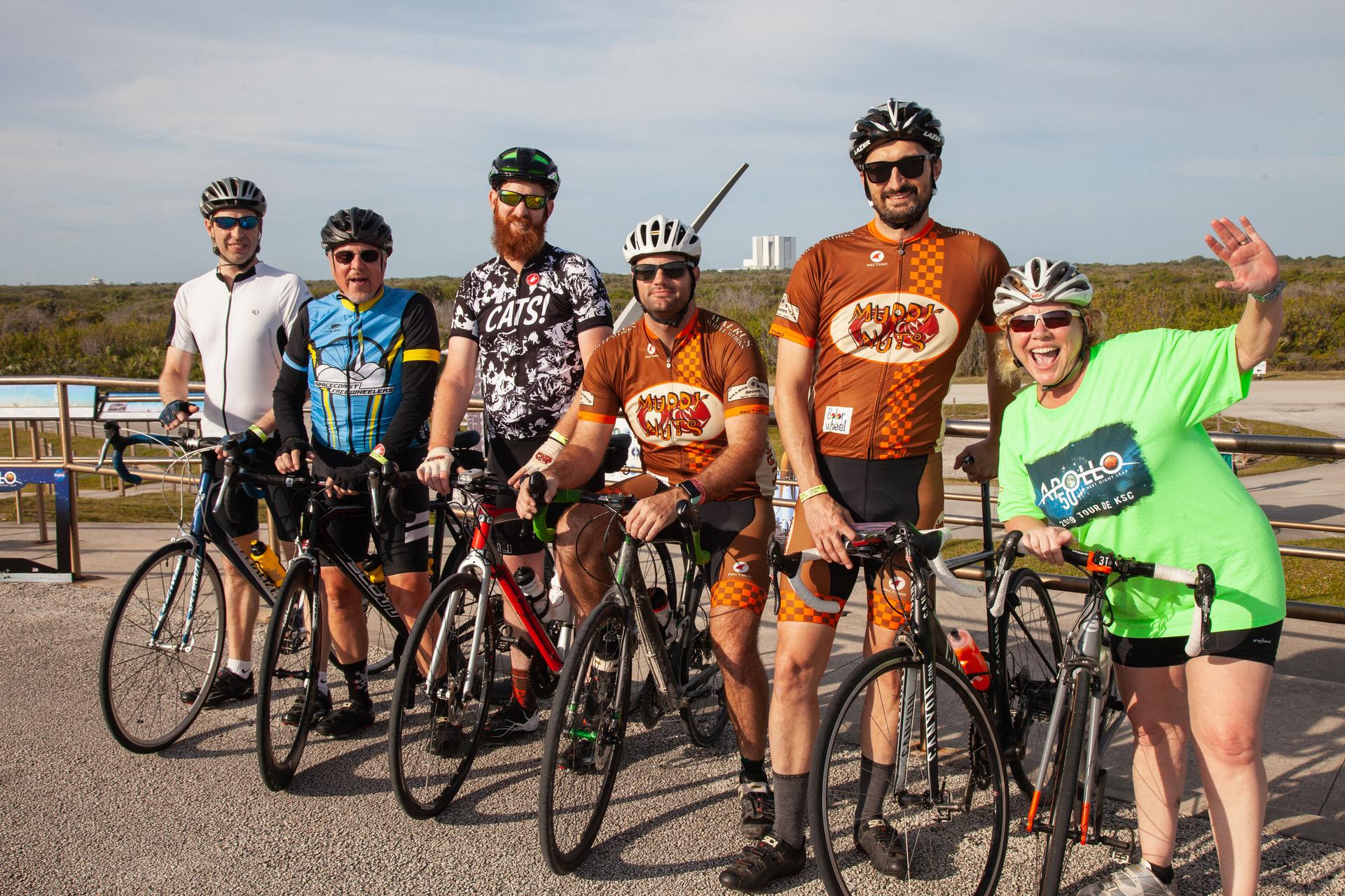 Cyclists pose for a photo with the Vehicle Assembly Building (VAB) faintly in the background during Kennedy Space Center’s annual Tour de KSC. The bicycle tour took place March 30, giving Kennedy employees and guests the opportunity to choose from three different routes that ranged from seven to 33 miles along some of the Florida spaceport’s most notable facilities such as the VAB, the Shuttle Landing Facility and historic Launch Pad 39A, among others.