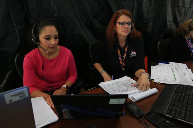 Charlie Blackwell-Thompson, at right, Exploration Mission-1 (EM-1) launch director, leads a countdown demonstration event of cryogenic propellant loading April 12, 2019, inside Firing Room 2 in the Launch Control Center at NASA’s Kennedy Space Center in Florida. Seated next to her is Jessica Parsons, technical assitant to the launch director. The practice simulation involved loading of liquid hydrogen and liquid oxygen into the Space Launch System rocket’s core and upper stages to prepare for EM-1. During the tanking exercise, the team worked through surprise issues in real-time. The practice countdown events are training opportunities coordinated by Blackwell-Thompson with Exploration Ground Systems.