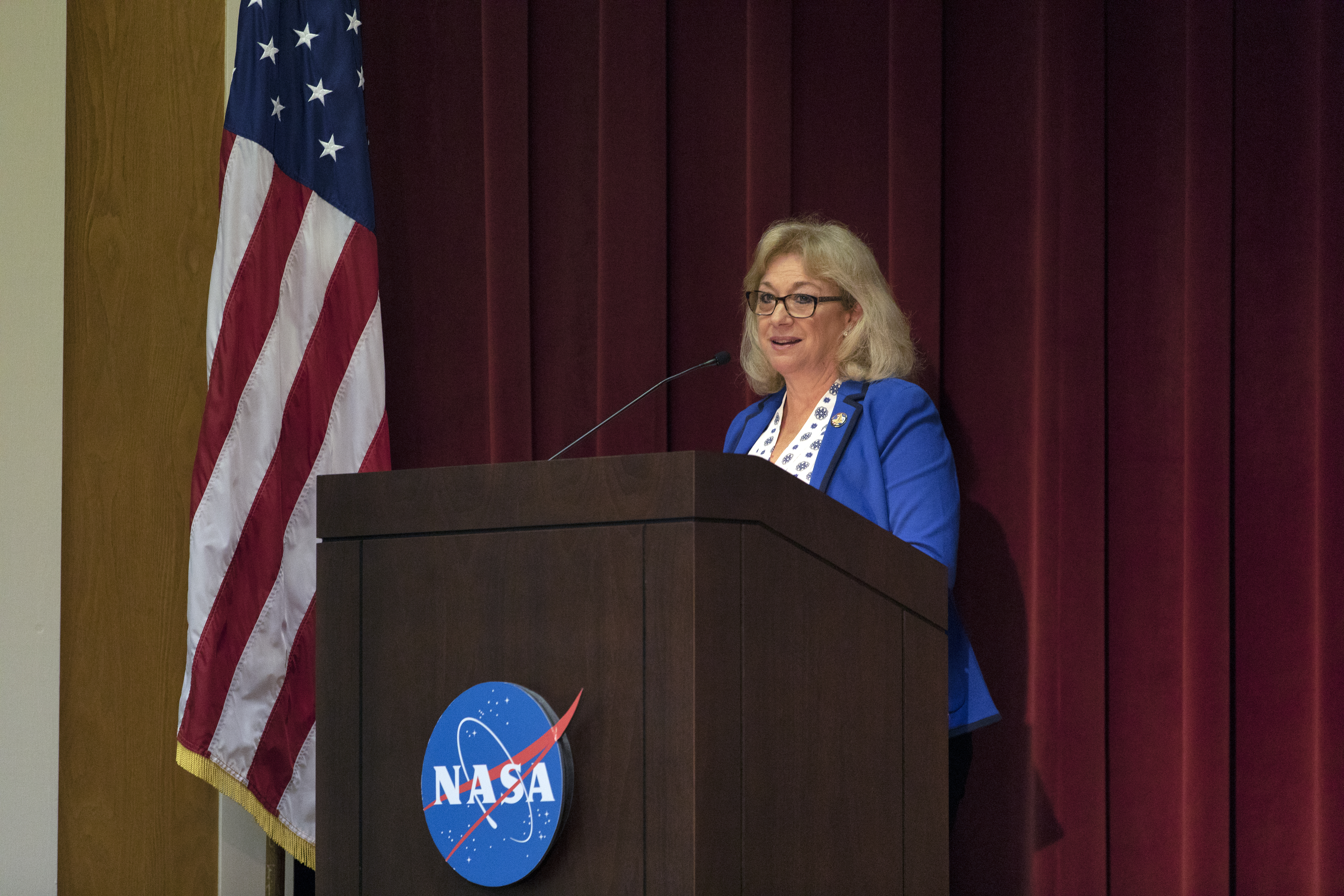 Evelyn Husband Thompson, widow of STS-107 Commander Rick Husband, speaks to NASA civil service and contractor employees and guests in Kennedy Space Center’s Training Auditorium on April 12, 2019. Husband Thompson was one of the presenters for “Columbia: The Mission Continues,” an event organized by the Apollo Challenger Columbia Lessons Learned Program (ACCLLP). The event is part of the Space Shuttle Columbia national tour and took place on the 38th anniversary of STS-1, the first orbital spaceflight of NASA’s Space Shuttle Program. The tour launched at Kennedy and will make its way to each of the 10 NASA centers.
