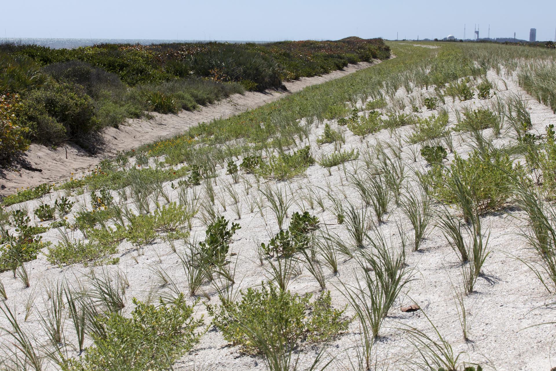 Native vegetation has been planted in the restored dunes at the north beaches at NASA’s Kennedy Space Center in Florida in this view on April 15, 2019. About 450,000 cubic yards of beach-quality sand, tested for compatibility, was transported to the space center’s beaches. After the dune was built up, native vegetation was replanted, helping to stabilize the dune and offer a habitat for Kennedy’s coastal wildlife. Dunes are affected by beach erosion and storm surge from tropical events, such as hurricanes. Restoration began in spring 2018 and was targeted to be completed by April 2019.