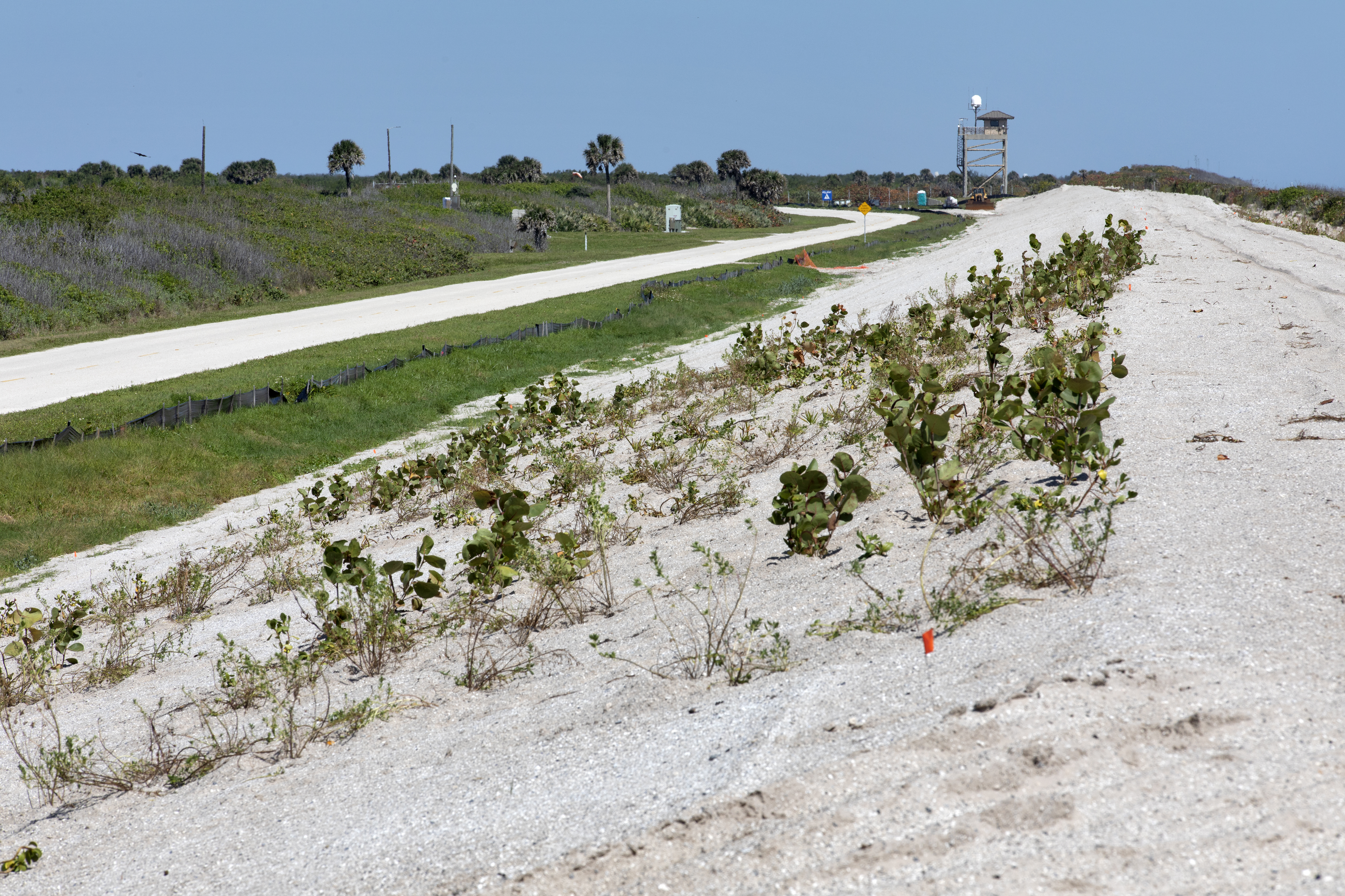 Restoration efforts are underway to the dunes at the north beaches at NASA’s Kennedy Space Center in Florida in this view on April 15, 2019. About 450,000 cubic yards of beach-quality sand, tested for compatibility, was transported to the space center’s beaches. After the dune was built up, native coastal vegetation was replanted, helping to stabilize the dune and offer a habitat for Kennedy’s coastal wildlife. Dunes are affected by beach erosion and storm surge from tropical events, such as hurricanes. Restoration began in spring 2018 and was targeted to be completed by April 2019.