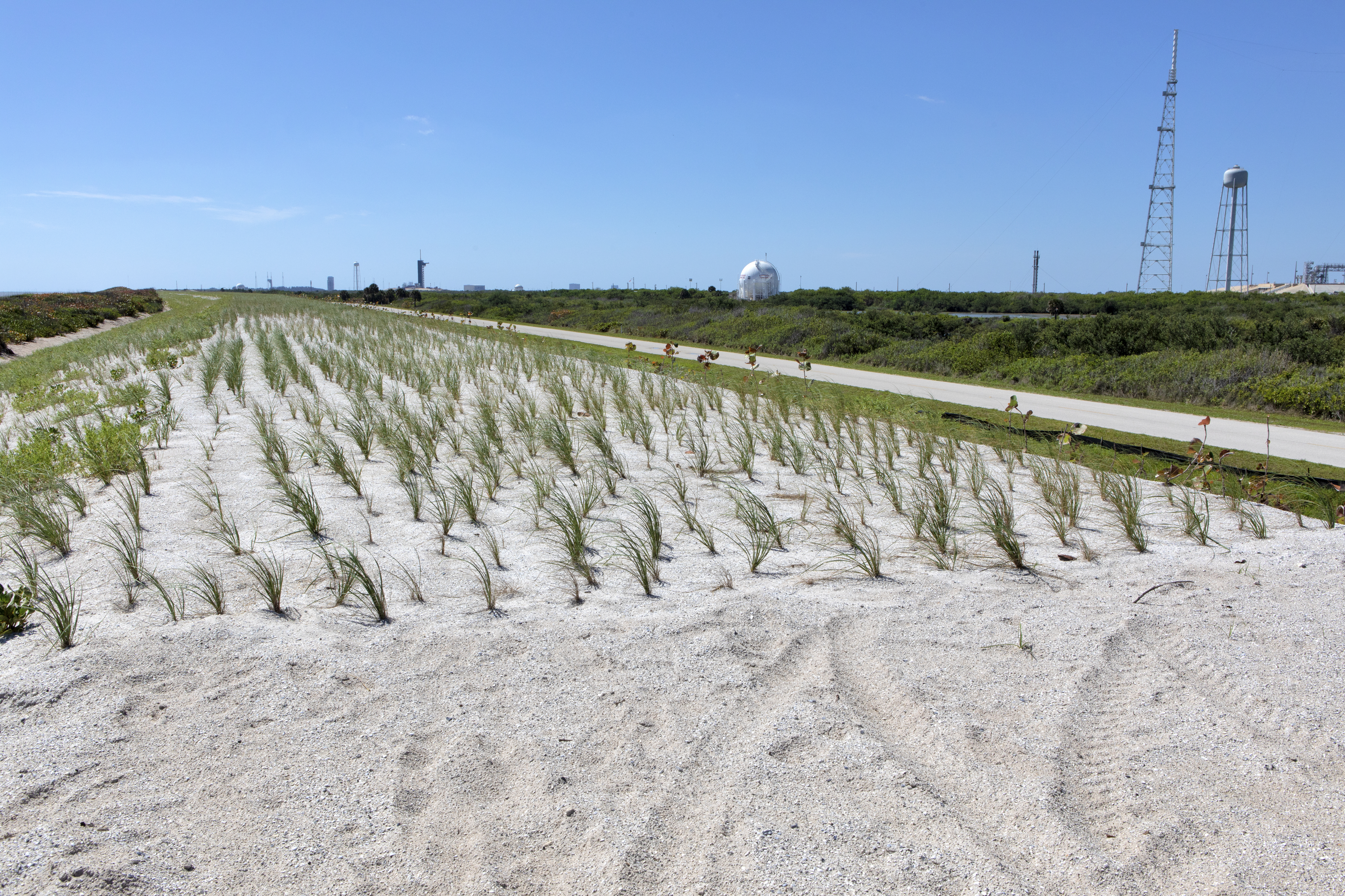 Restoration efforts are underway to the dunes at the north beaches at NASA’s Kennedy Space Center in Florida in this view on April 15, 2019. About 450,000 cubic yards of beach-quality sand, tested for compatibility, was transported to the space center’s beaches. After the dune was built up, native coastal vegetation was replanted, helping to stabilize the dune and offer a habitat for Kennedy’s coastal wildlife. Dunes are affected by beach erosion and storm surge from tropical events, such as hurricanes. Restoration began in spring 2018 and was targeted to be completed by April 2019.