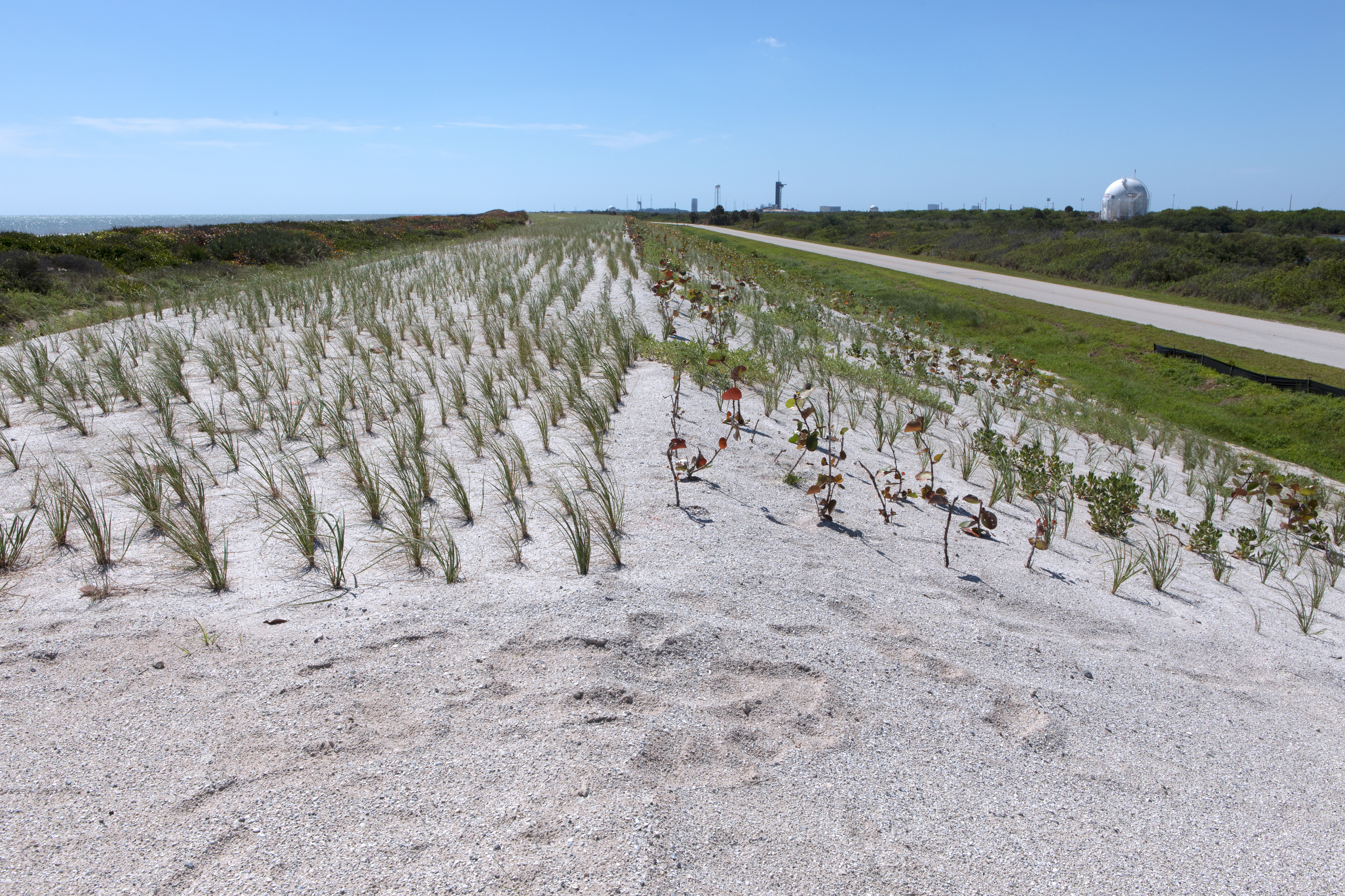 Restoration efforts are underway to the dunes at the north beaches at NASA’s Kennedy Space Center in Florida in this view on April 15, 2019. About 450,000 cubic yards of beach-quality sand, tested for compatibility, was transported to the space center’s beaches. After the dune was built up, native coastal vegetation was replanted, helping to stabilize the dune and offer a habitat for Kennedy’s coastal wildlife. Dunes are affected by beach erosion and storm surge from tropical events, such as hurricanes. Restoration began in spring 2018 and was targeted to be completed by April 2019.