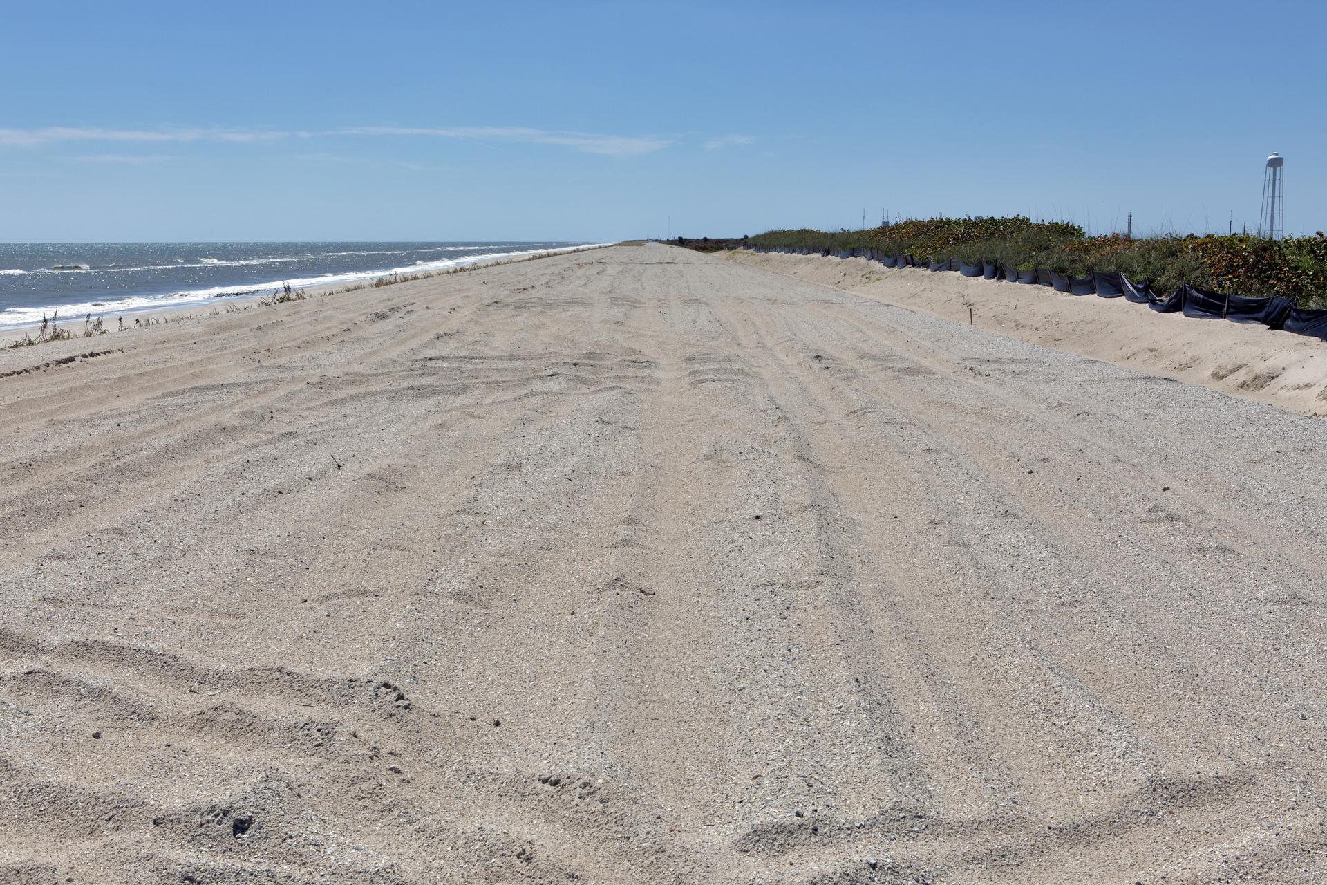 Restoration efforts are underway to the dunes at the north beaches at NASA’s Kennedy Space Center in Florida in this view on April 15, 2019. About 450,000 cubic yards of beach-quality sand, tested for compatibility, was transported to the space center’s beaches. Once the dune is built up, native coastal vegetation will be replanted, helping to stabilize the dune and offer a habitat for Kennedy’s coastal wildlife. Dunes are affected by beach erosion and storm surge from tropical events, such as hurricanes. Restoration began in spring 2018 and was targeted to be completed by April 2019.