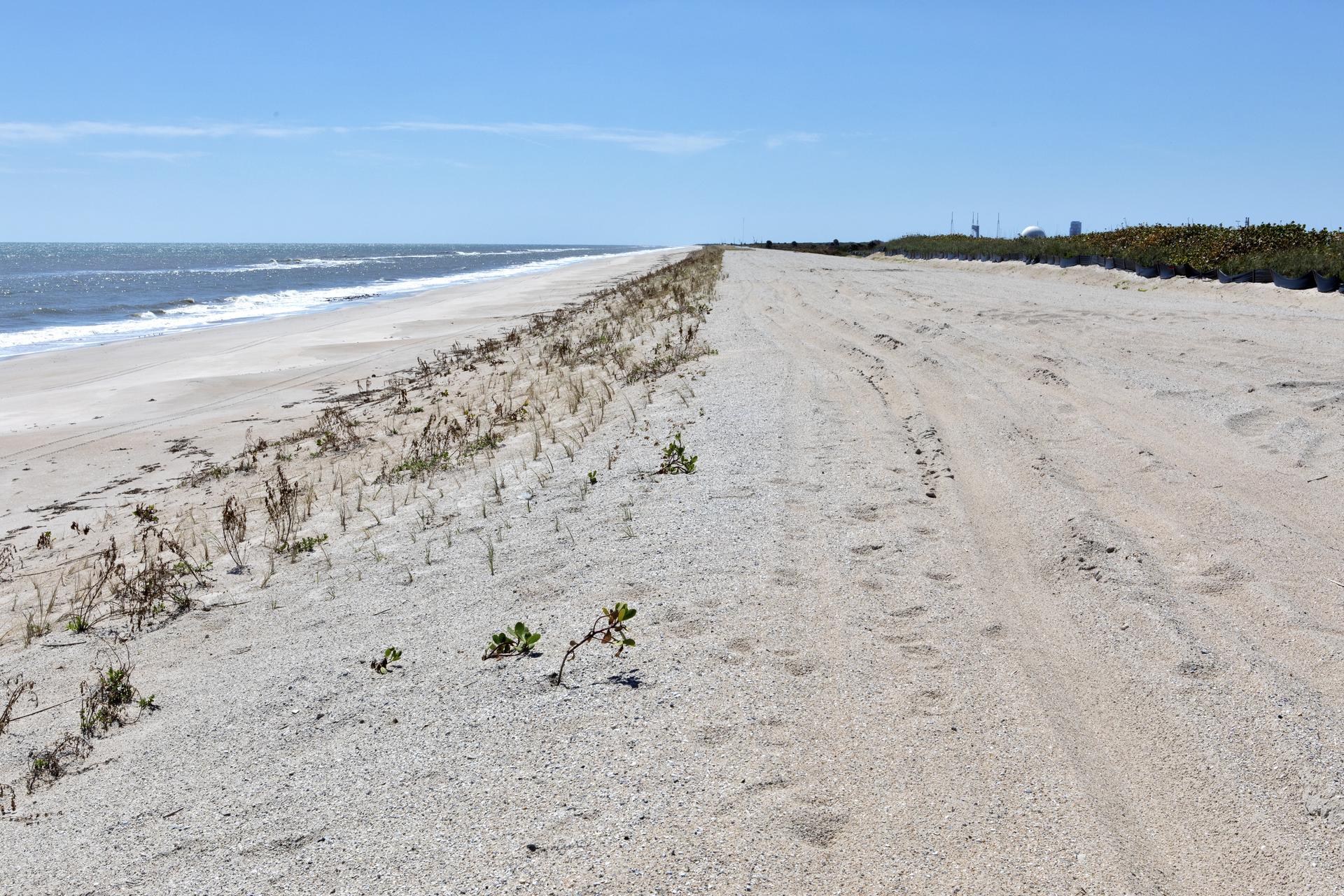 Restoration efforts are underway to the dunes at the north beaches at NASA’s Kennedy Space Center in Florida in this view on April 15, 2019. About 450,000 cubic yards of beach-quality sand, tested for compatibility, was transported to the space center’s beaches. After the dune was built up, native coastal vegetation was replanted, helping to stabilize the dune and offer a habitat for Kennedy’s coast wildlife. Dunes are affected by beach erosion and storm surge from tropical events, such as hurricanes. Restoration began in spring 2018 and was targeted to be completed by April 2019.