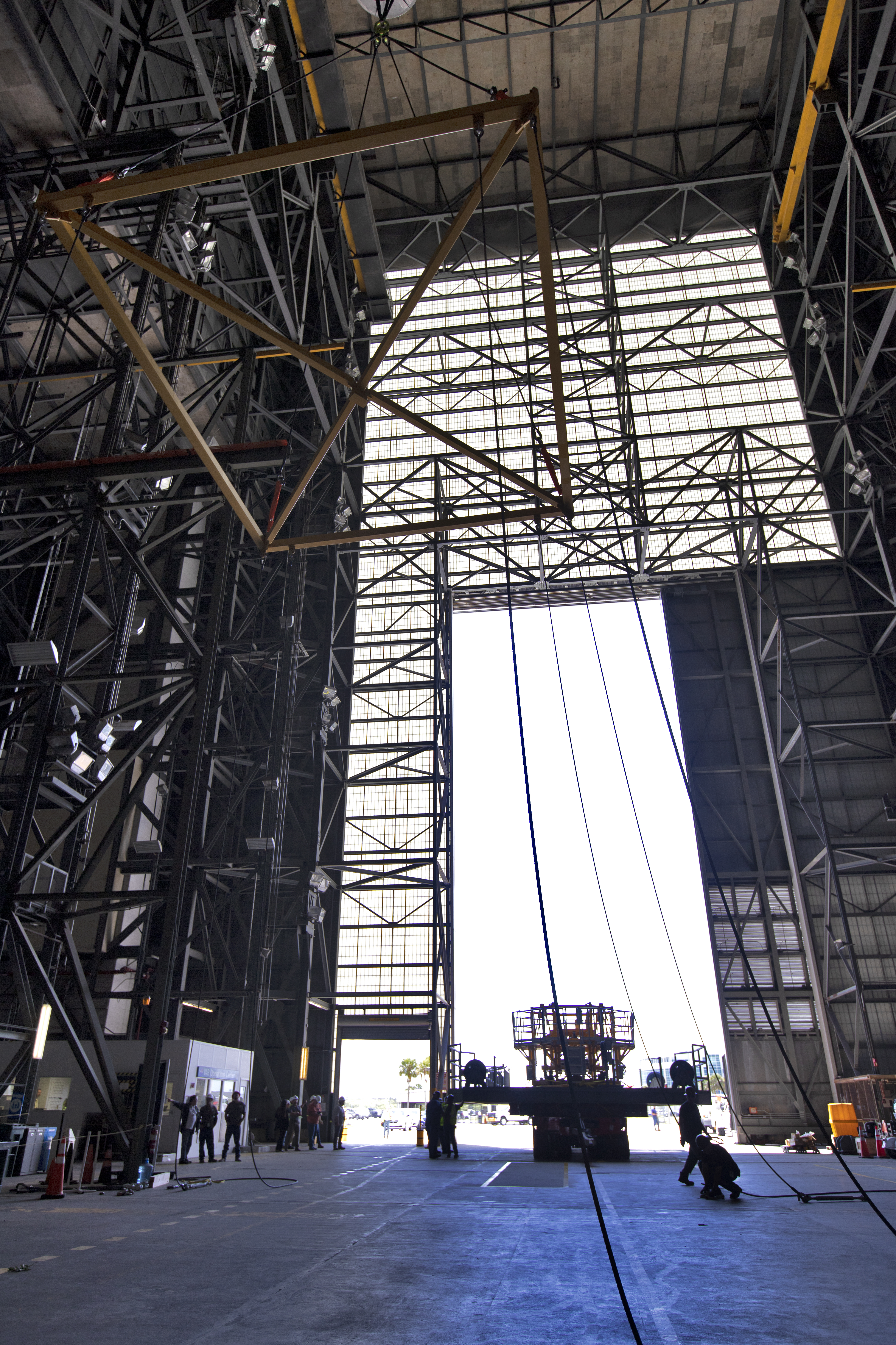 The engine vertical installer for NASA’s Space Launch System (SLS) arrives inside the Vehicle Assembly at NASA’s Kennedy Space Center in Florida on April 25, 2019. The engine installer arrived from the manufacturer, Precision Fabrication and Cleaning in Canaveral Groves, Florida. The new ground support equipment will be ready for preflight processing in the event one of the four RS-25 engines on the core stage of the SLS rocket needs to be replaced. During launch of the SLS and Orion spacecraft, the four core stage engines will provide the thrust needed to lift the rocket and Orion spacecraft off Launch Pad 39B at Kennedy for Exploration Mission-1. The uncrewed Orion will travel on a three-week test mission thousands of miles beyond the Moon and back to Earth for a splashdown in the Pacific Ocean.