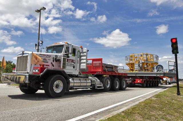The engine vertical installer for NASA’s Space Launch System (SLS) arrives by large transport truck at NASA’s Kennedy Space Center in Florida on April 25, 2019. The engine installer arrived from the manufacturer, Precision Fabrication and Cleaning in Canaveral Groves, Florida. The new ground support equipment will be delivered to the Vehicle Assembly where it will be ready for preflight processing in the event one of the four RS-25 engines on the core stage of the SLS rocket needs to be replaced. During launch of the SLS and Orion spacecraft, the four core stage engines will provide the thrust needed to lift the rocket and Orion spacecraft off Launch Pad 39B at Kennedy for Exploration Mission-1. The uncrewed Orion will travel on a three-week test mission thousands of miles beyond the Moon and back to Earth for a splashdown in the Pacific Ocean.