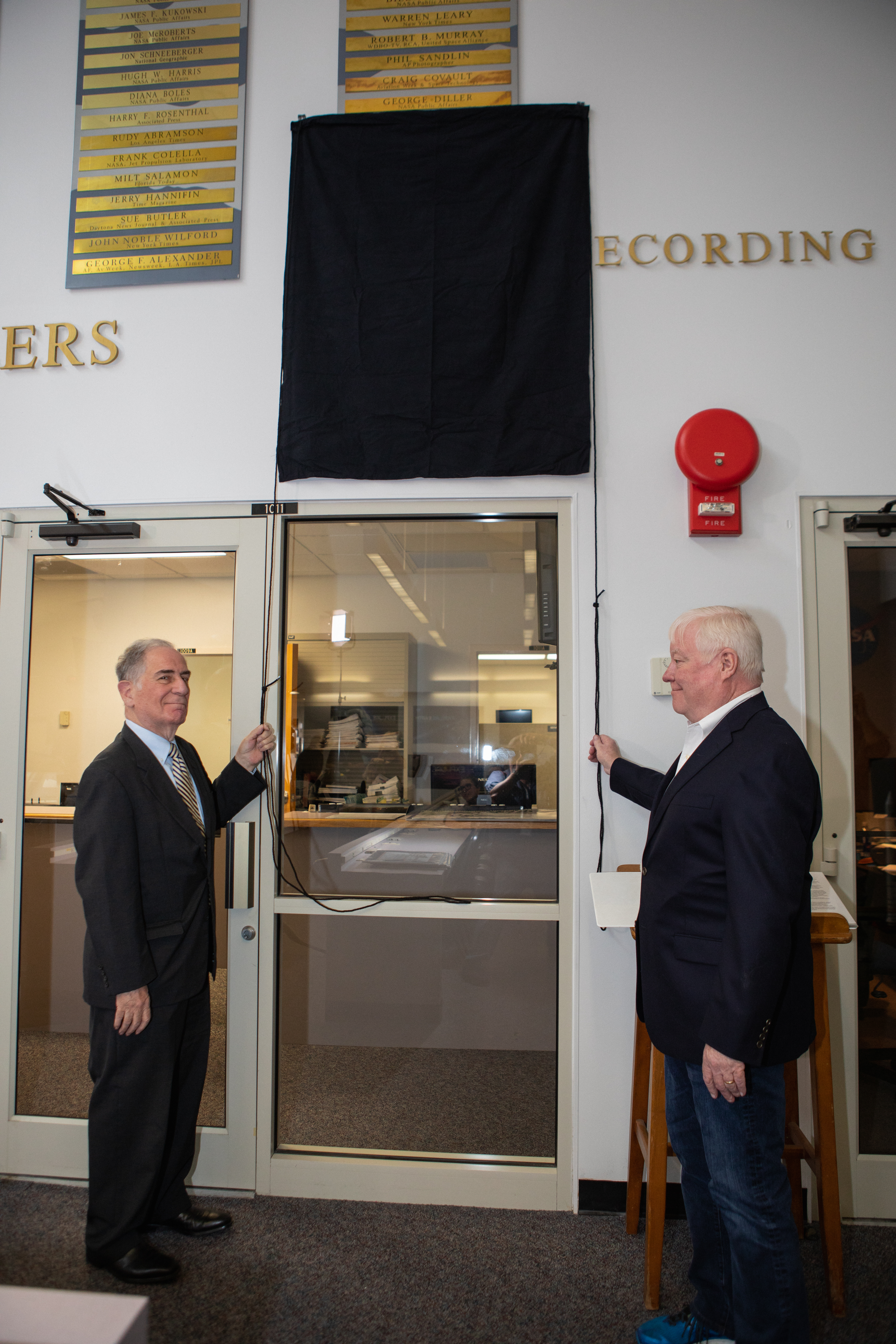 Vic Ratner, left, and Todd Halvorson unveil their names, along with the names of Jim Banke and Peter Cosgrove, now on display on The Chroniclers wall at Kennedy Space Center’s NASA News Center in Florida during a ceremony May 3, 2019. Banke, Halvorson, Ratner and Cosgrove were honored as members of The Chroniclers, which recognizes retirees of the news and communications business who have helped spread news of American space exploration from Kennedy for 10 years or more. They were selected by a committee of their peers on March 25.