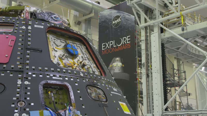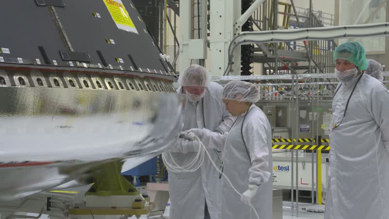 The Orion Crew Module for Exploration Mission-1 moves from assembly work station to direct field acoustic test center inside the Operations and Checkout Building.