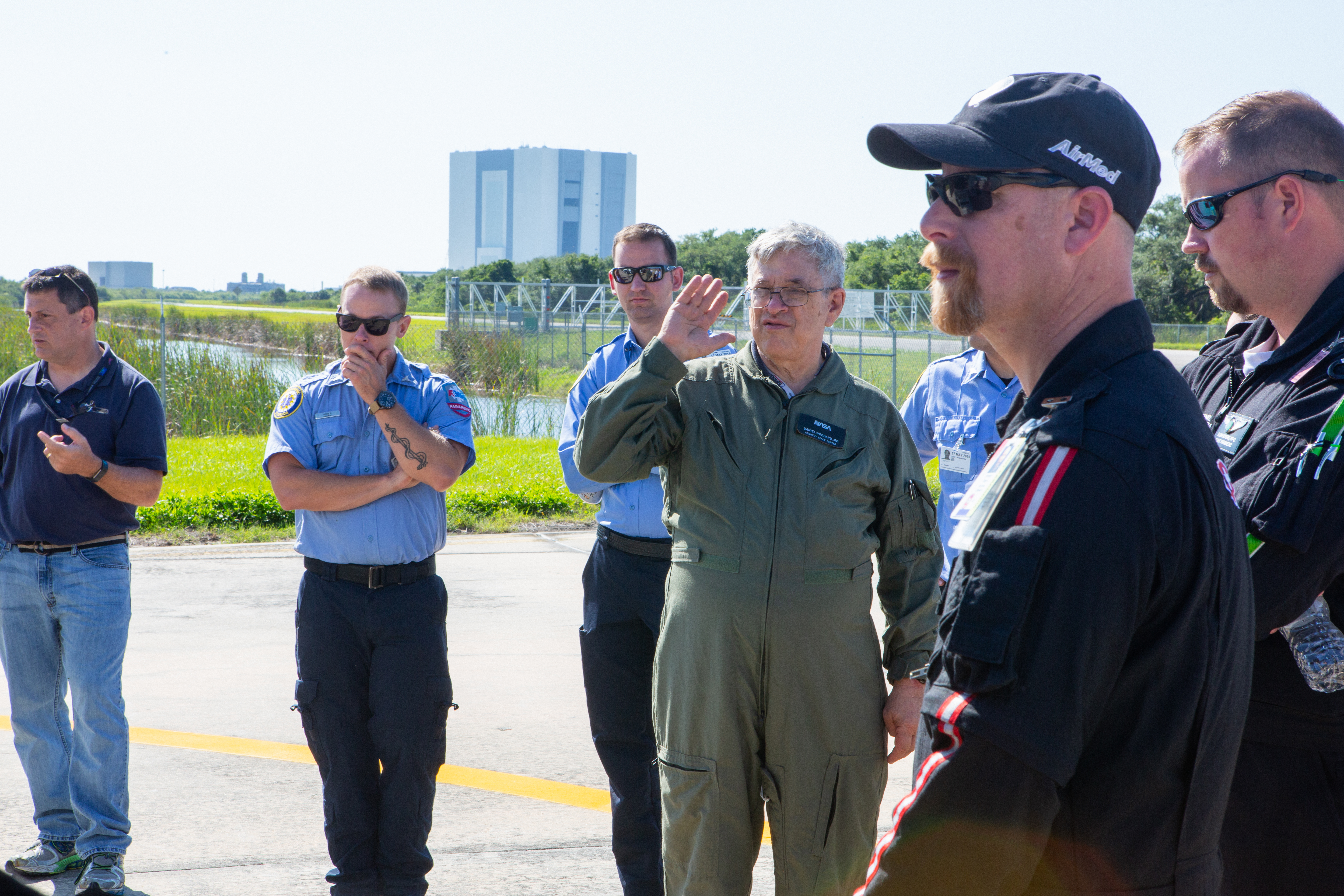 KEMCON physician Dr. Dan Woodard speaks to Kennedy Space Center personnel and American Medical Response (AMR) contractor paramedics gathered at the Florida spaceport’s Shuttle Landing Facility on May 17, 2019, for a medical support training course. The course was designed to familiarize the AMR paramedics with the center’s Triage Forces deployment, which included medical team members, fire/rescue personnel, environmental health specialists and flight operations crew members, as well as a helicopter, Mine Resistant Ambush Protected (MRAP) tactical vehicle, fire pumper truck and triage vehicles. The AMR paramedics will assist the agency in contingency planning for the return of human spaceflight from Kennedy.