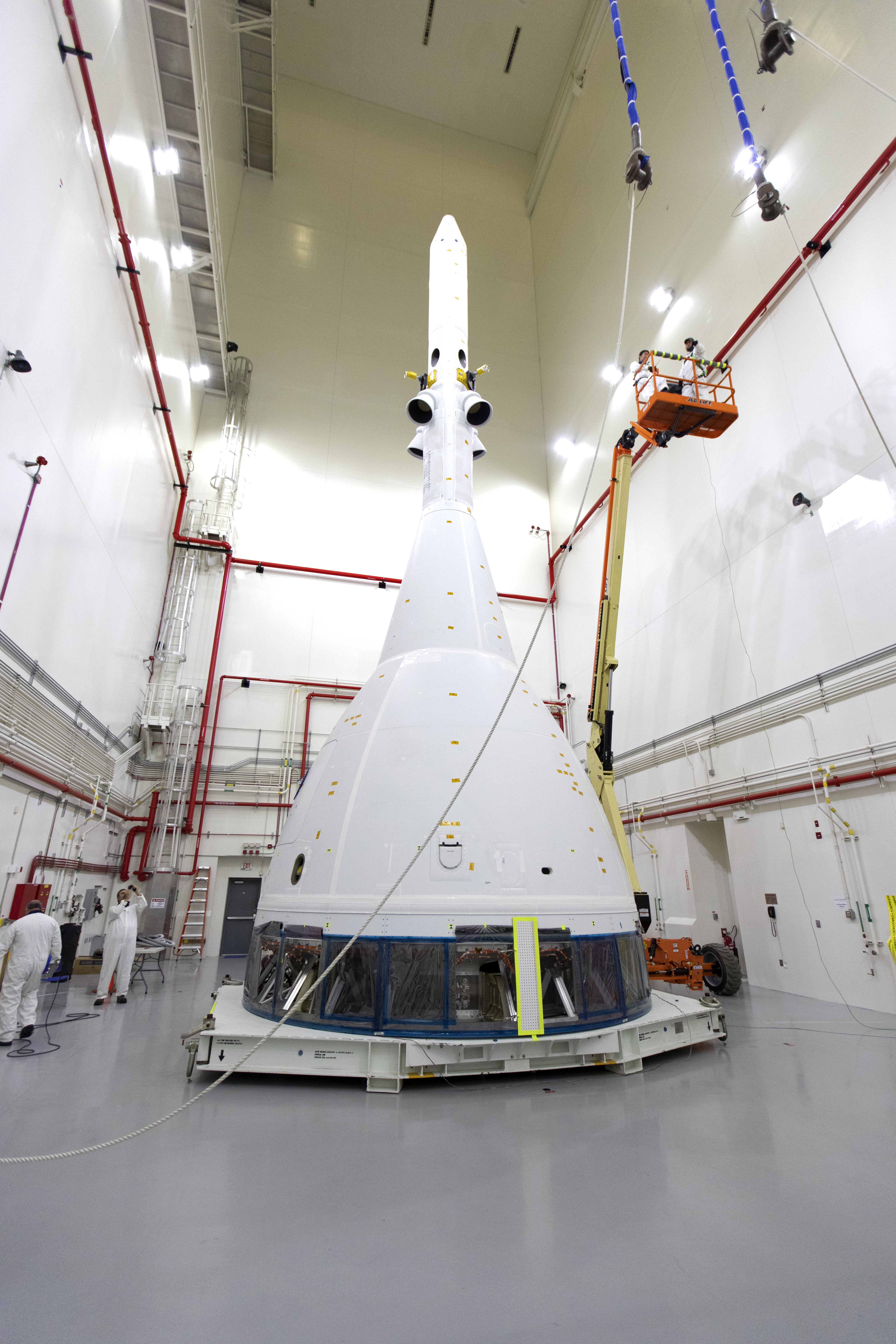 Inside the Launch Abort System Facility (LASF) at NASA’s Kennedy Space Center in Florida, workers are completing the integration of a test version of the Orion crew module with the Launch Abort System (LAS) on May 18, 2019. The test vehicle and the LAS will be used for the Orion Ascent Abort-2 (AA-2) Flight Test. AA-2 is a full-stress test of the LAS, planned for July 2. AA-2 will launch from Space Launch Complex 46, carrying a fully functional LAS and a 22,000-pound Orion test vehicle to an altitude of 31,000 feet and traveling at more than 1,000 miles an hour. The test will verify the LAS can steer the crew module and astronauts aboard to safety if an emergency occurs during ascent on the Space Launch System (SLS) rocket. NASA's Orion and Exploration Ground Systems programs, contractors Jacob's, Lockheed Martin and Northrop Grumman, in conjunction with the Air Force Space and Missile Center's Launch Operations branch and the 45th Space Wing are performing flight operations for AA-2.